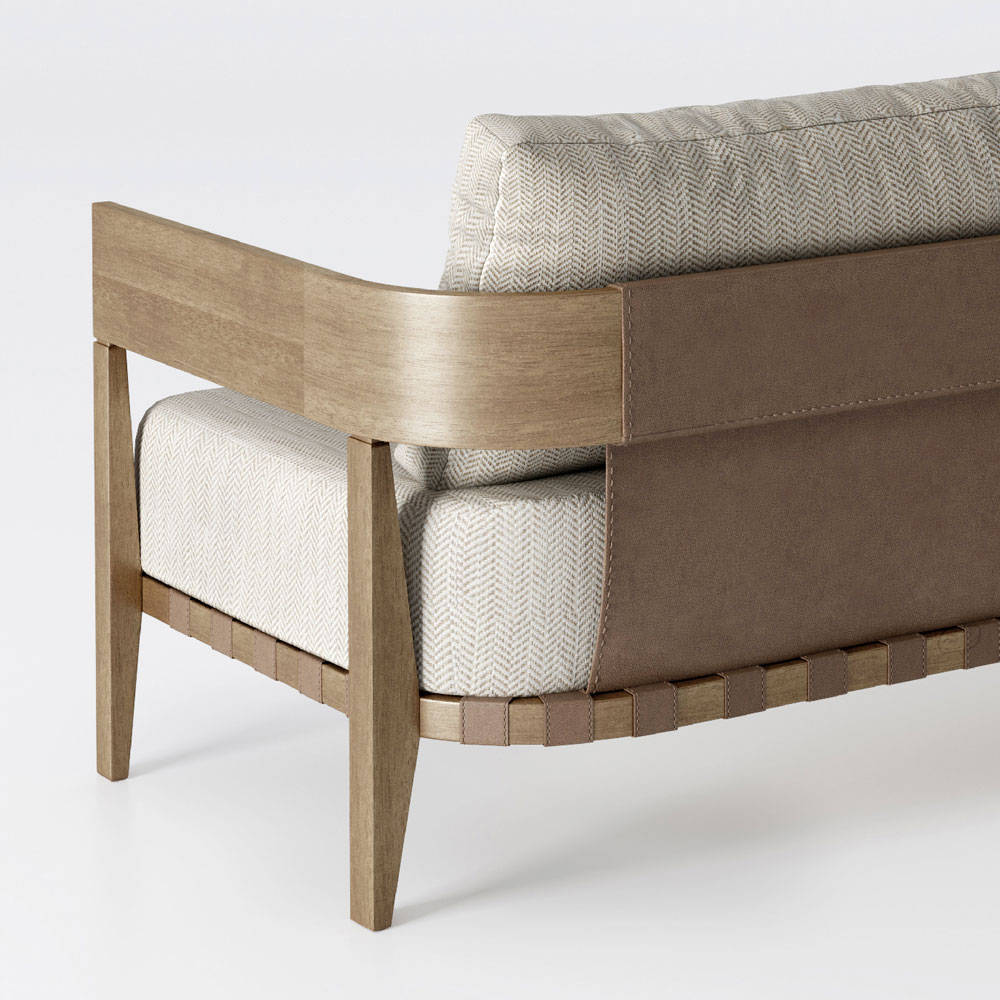 Komplett in Italien hergestelltes Outdoor-Sofa mit Sitz- und Rückenkissen aus gepolstertem Stoff und Struktur aus verwittertem Teakholz. Die Sitzstruktur und die Rückenlehne des Sofas sind mit genähtem Leder verziert. Dieses Produkt mit zarten und essentiellen Linien ist perfekt für alle, die den modernen und minimalistischen Stil lieben. Die organische Form und die skulpturalen Beine verschmelzen zu einem einfachen Element mit harmonischen Proportionen, das sich für jede Außenumgebung eignet und eine charmante Atmosphäre mit einfachen Linien und Retro-Geschmack schafft. Die für die Herstellung verwendeten Materialien garantieren Qualität und Beständigkeit auch im Laufe der Zeit und machen dieses Einrichtungsaccessoire perfekt für jede Situation und jeden Verwendungszweck.
