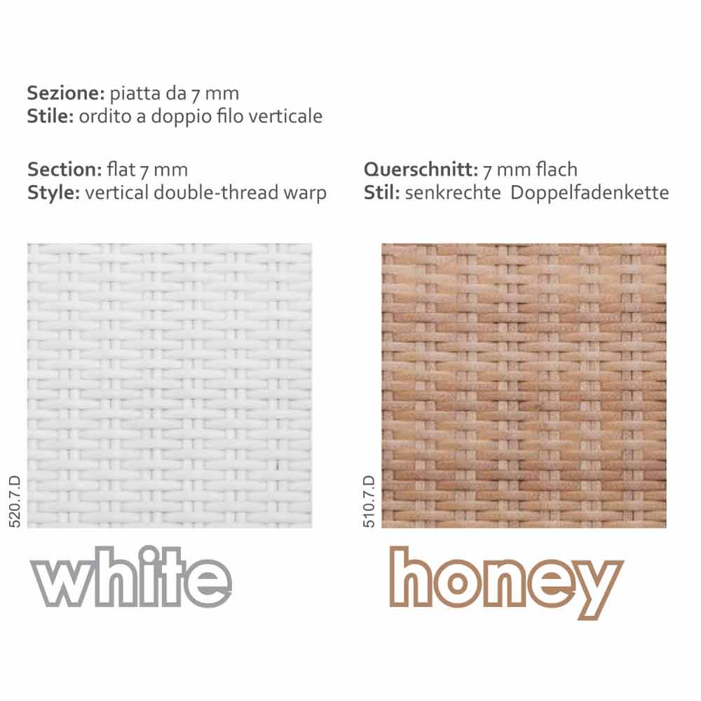 Gestell aus Aluminium und Polyethylen, 7 mm dick und handgeflochten. In verschiedenen Farben erhältlich: weiß oder Honig