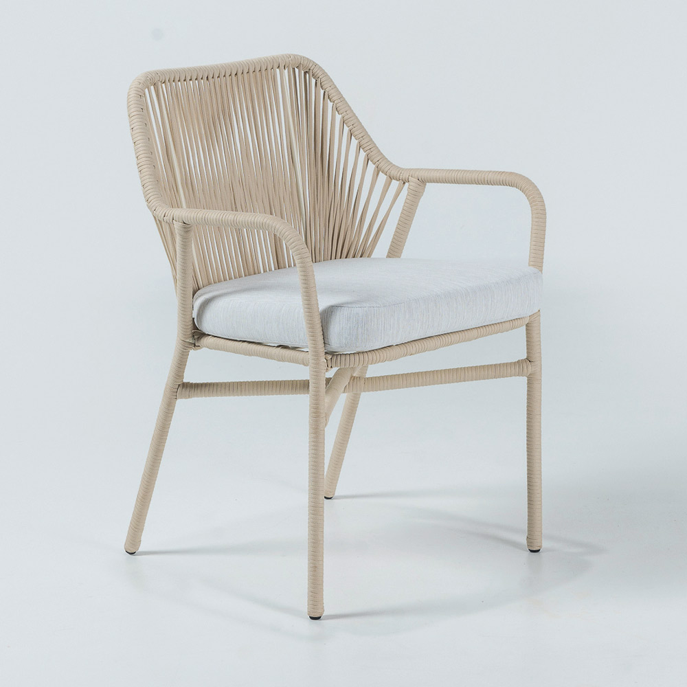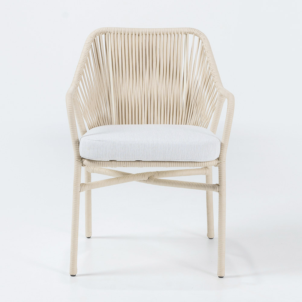 Outdoor-Sessel mit Aluminiumrahmen, Olefin/PP ROPE-Geflecht und Sitzkissen aus Olefin in der Serienfarbe „Off White“.