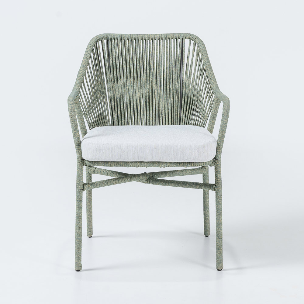 Die Rahmenfarbe fügt sich harmonisch in die natürliche Umgebung ein, während das weiße Kissen einen weichen und einladenden Kontrast bildet. Der Sessel verfügt über ein gepolstertes Sitzkissen für maximalen Komfort, sodass Sie sich vollkommen entspannen und die Ruhe Ihres Außenbereichs genießen können.