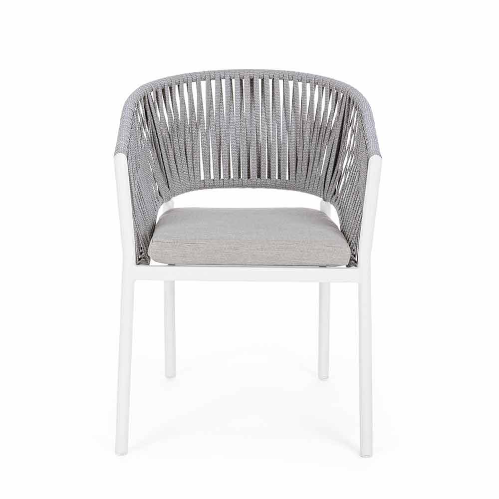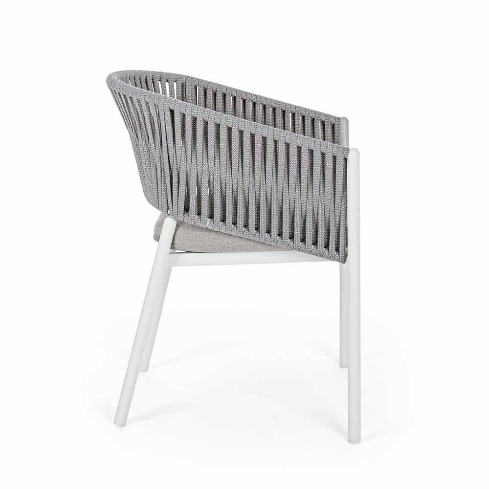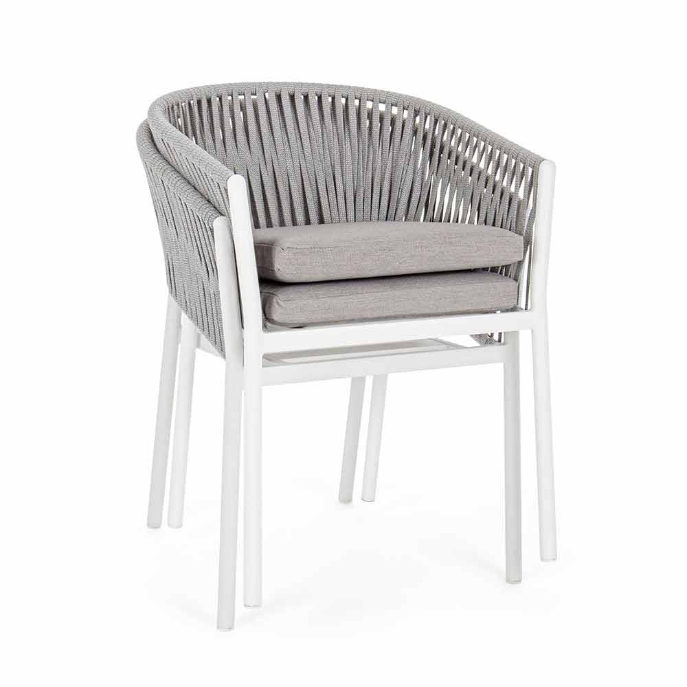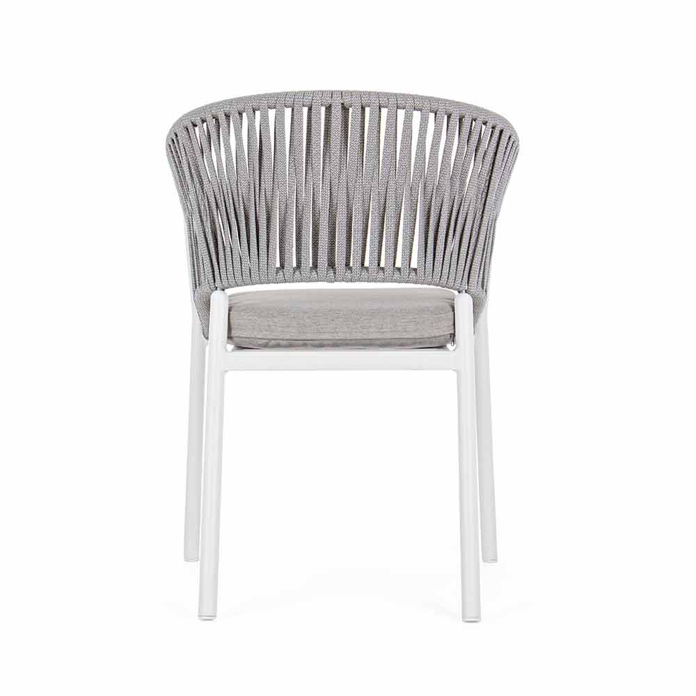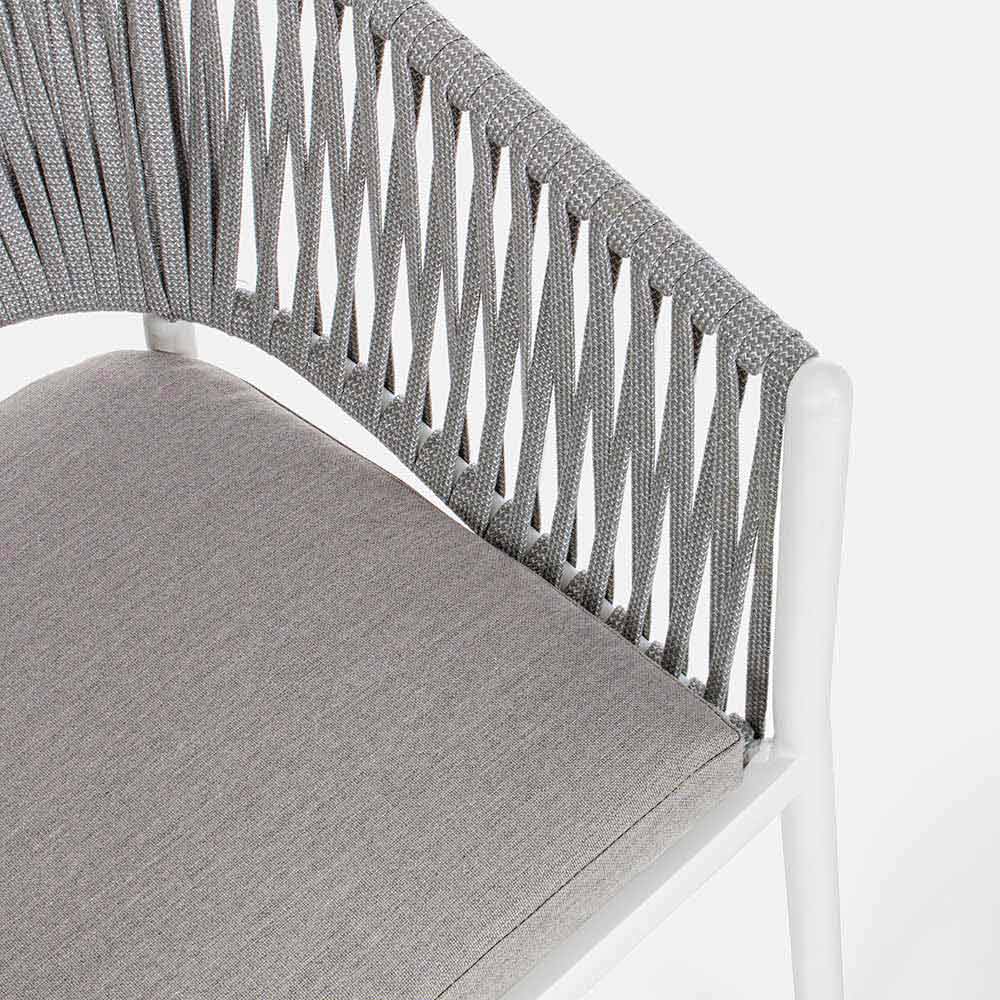 Moderner Gartenstuhl aus weißem Aluminium mit Seil- und Kissenbindung, Design, stapelbar.