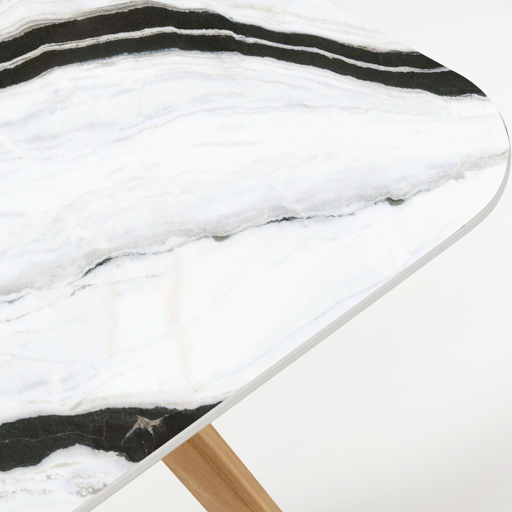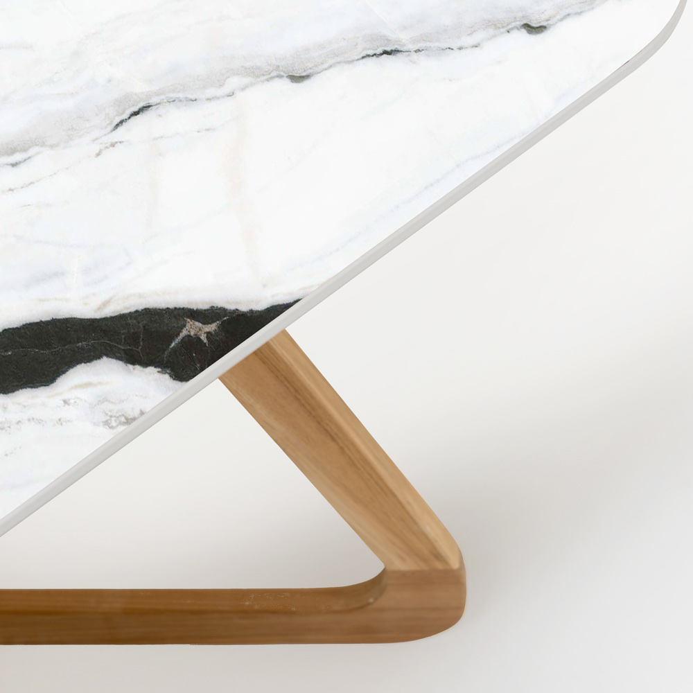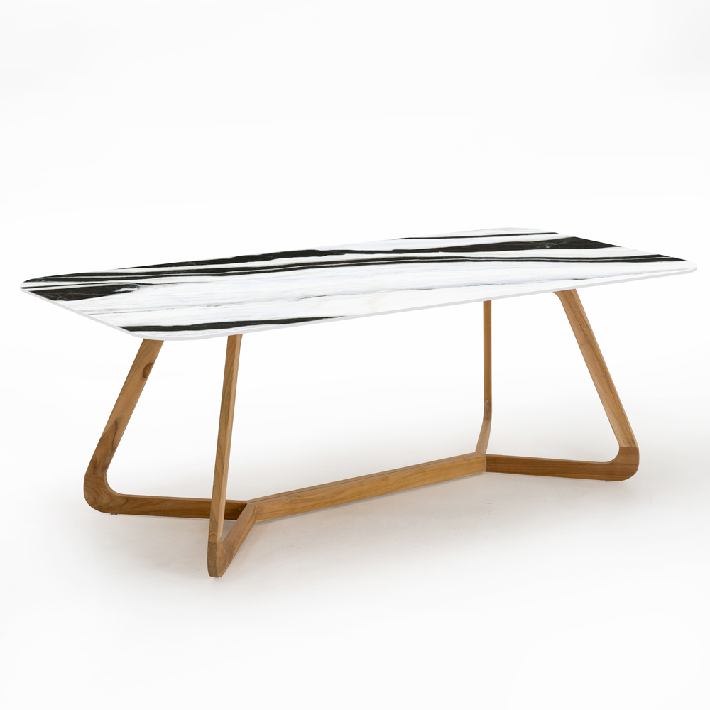 in Italien hergestellt. Dieser Gartentisch ist ein wahres Design-Meisterwerk und vereint die Wärme von Holz mit der eleganten Reinheit von Panda White Keramik. Diese markante Tischplatte mit kräftiger schwarzer Maserung auf reinweißem Hintergrund ist nicht nur optisch ansprechend, sondern auch unglaublich langlebig und pflegeleicht – perfekt für jeden Außenbereich.