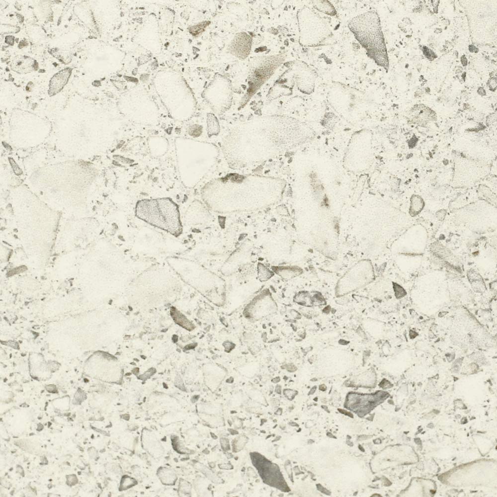 Gartentisch mit einer Basis aus massivem natürlichem Teakholz (35 mm dick), einer Infinity-Steinzeugkeramikplatte (12 mm dick) mit mattweißem Terrazzo- Finish und einem Untergestell aus Okumé-Bootssperrholz , vollständig in Italien hergestellt.