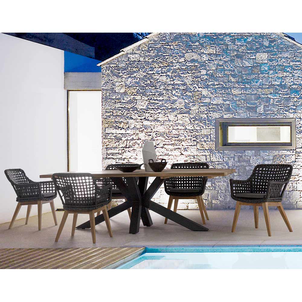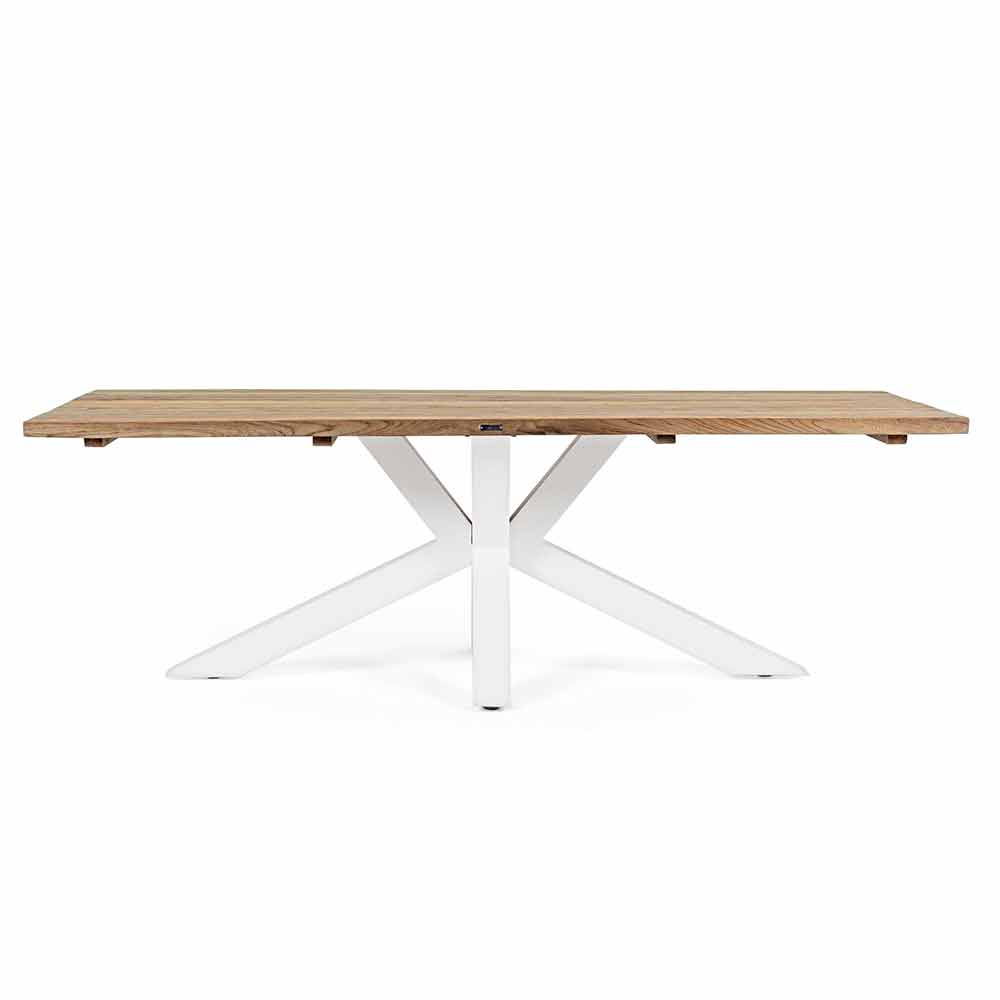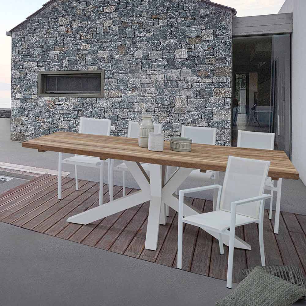 Moderner Außentisch mit weißen oder schwarzen Aluminiumbeinen und Teakholzplatte für 10 Personen.