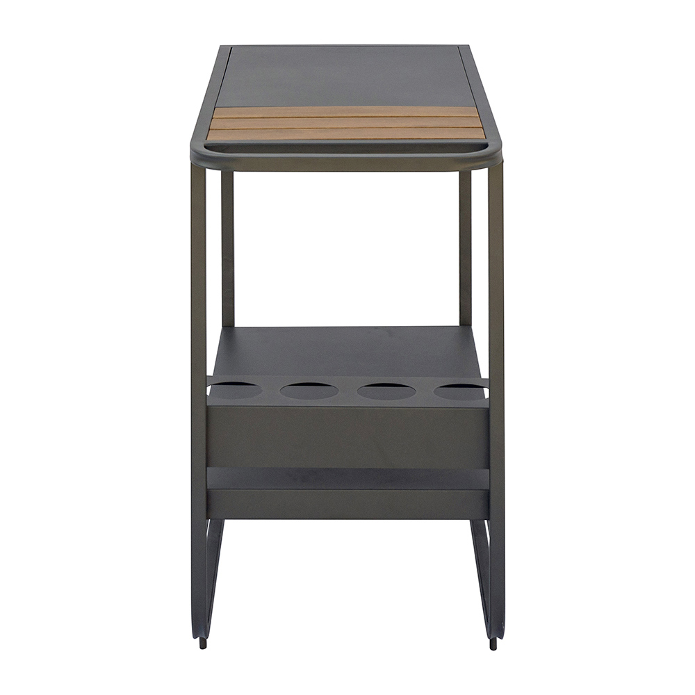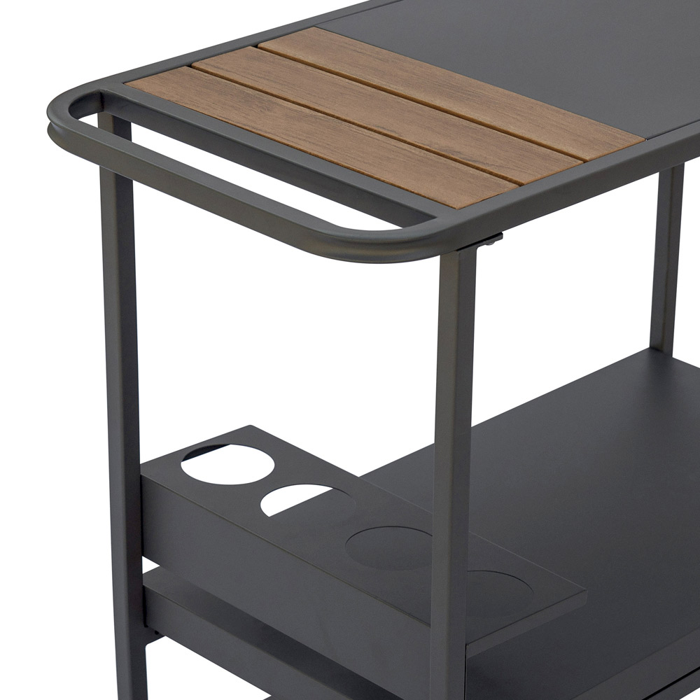 Die obere Ablage mit Details aus Kunstharzholz verleiht dem modernen Design eine warme, natürliche Note und schafft einen angenehmen ästhetischen Kontrast. Die untere Ablage und der integrierte Flaschenhalter bieten zusätzlichen Platz für Getränke, Gläser und Accessoires und machen diesen Servierwagen zum perfekten Begleiter für Mittagessen, Aperitifs oder Abendessen im Freien.