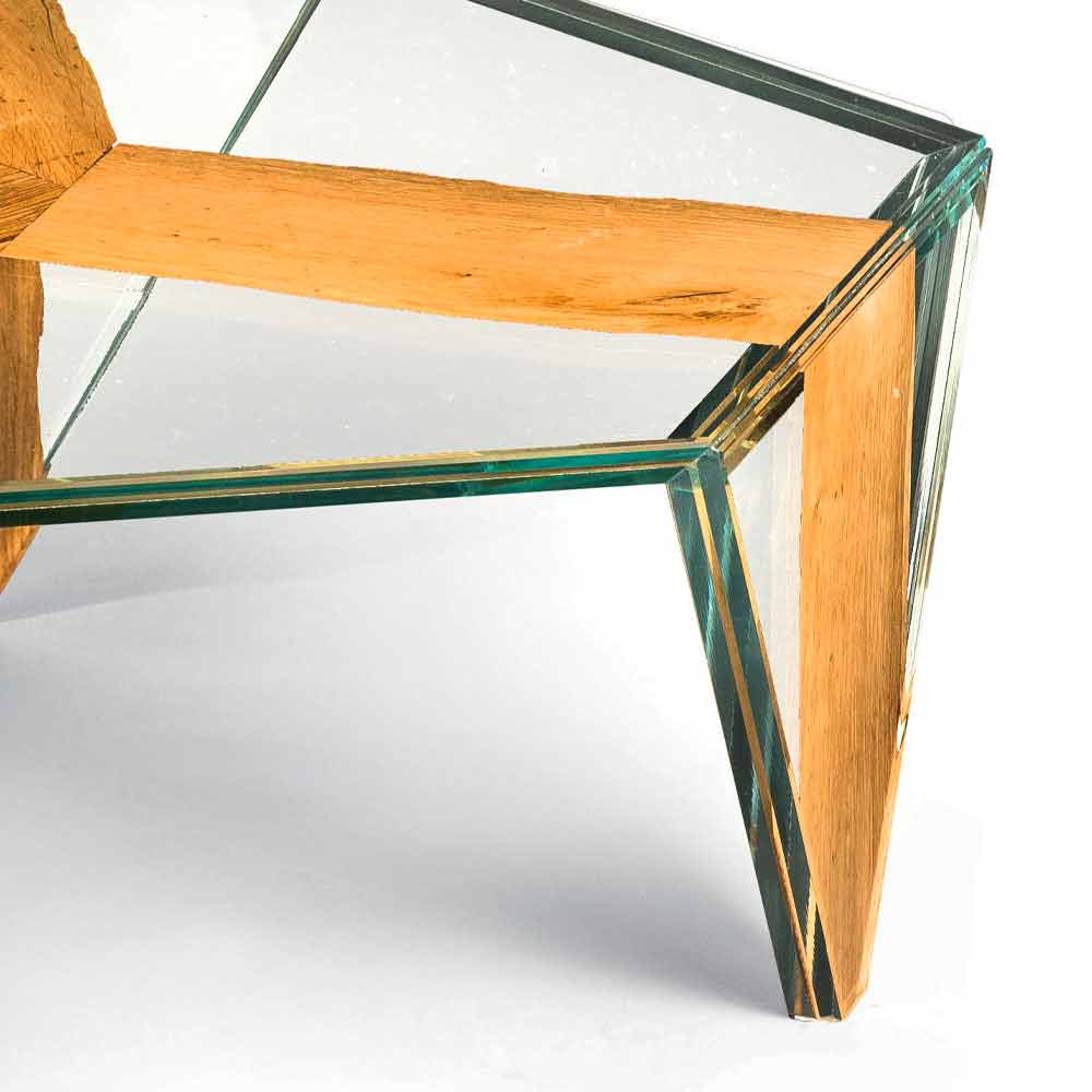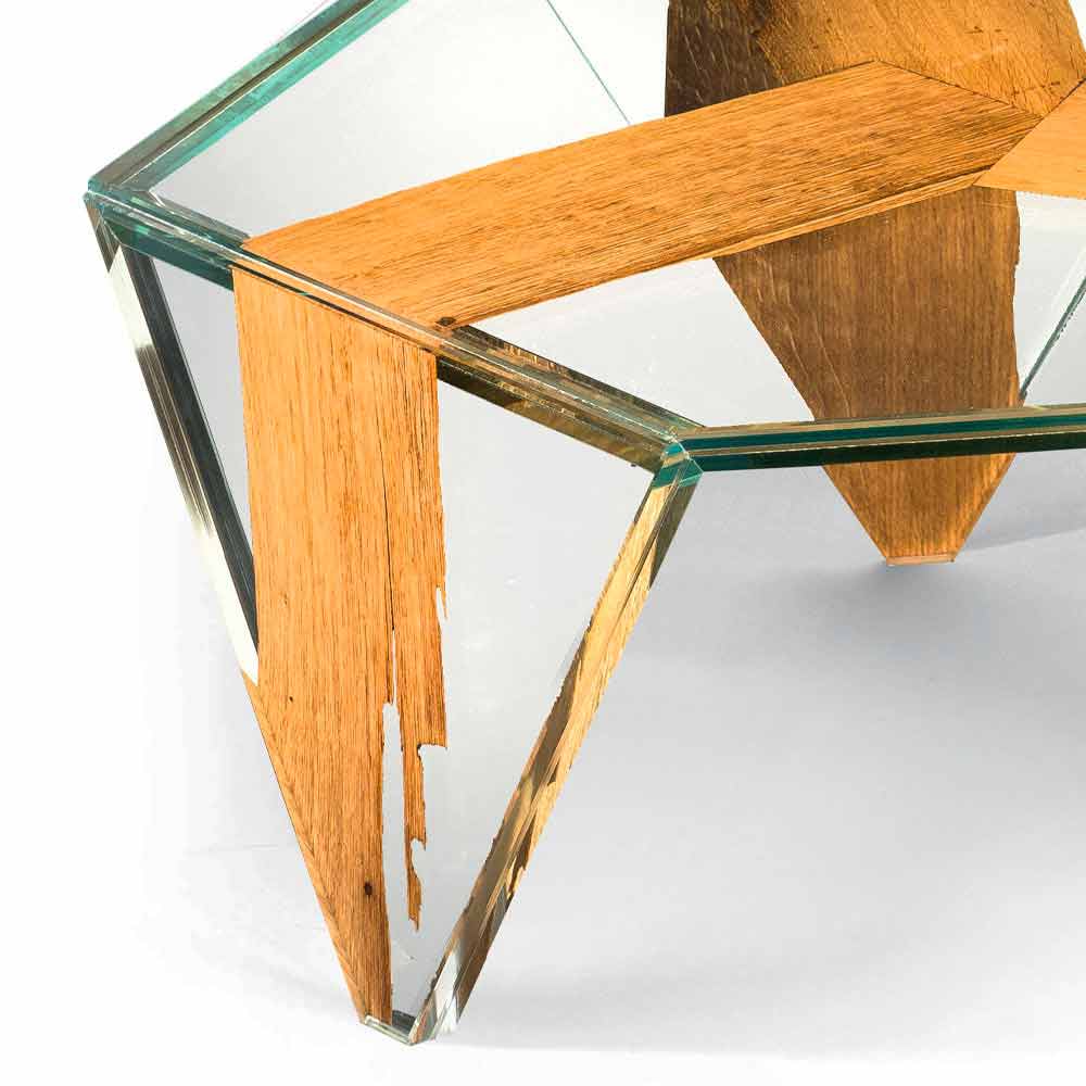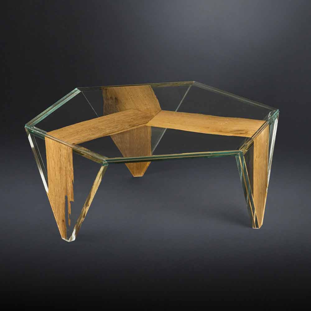 Couchtisch mit sechseckiger Platte vollständig in Italien hergestellt aus Verbundglas (10 + 10 mm), in das ein dünner Abschnitt aus Eichenholz Briccola eingelegt ist. Aus der Verbindung zwischen dem Charme des Holzes und seinen Maserungen, die an die Natur erinnern, und der zeitlosen Eleganz von Glas , das an die Transparenz des Wassers erinnert, entsteht ein exklusives Einrichtungsaccessoire , das sich durch eine starke, raffinierte Persönlichkeit auszeichnet. Seine Stärke wird durch die ursprüngliche Form und durch die wunderbare Kombination von Oberflächen und Materialien repräsentiert, die seinen Wert steigern, ohne jemals den grundlegenden funktionalen Aspekt zu vernachlässigen, der durch die 100% Made in Italy-Verarbeitung und die Verwendung hochwertiger Rohstoffe unterstrichen wird. um den perfekten Couchtisch anzubieten, der jeden Wohnbereich mit einem zeitgenössischen Geschmack stilvoll vervollständigt.