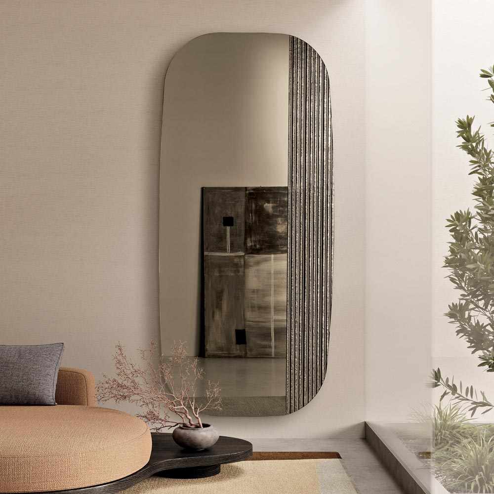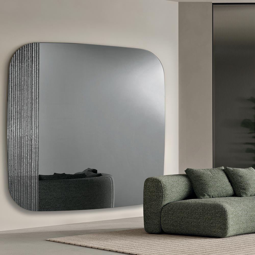 Die reflektierende Oberfläche zeichnet sich durch eine geschwungene Form mit sanft abgerundeten Ecken aus, die einen weichen und harmonischen visuellen Effekt erzeugt. Das Design wird durch einen Ton-in-Ton gehaltenen, rückseitig versilberten, gerippten Glaseinsatz veredelt, der Tiefe und Dynamik verleiht und ein raffiniertes Zusammenspiel von Licht und Textur auf der Spiegeloberfläche schafft.