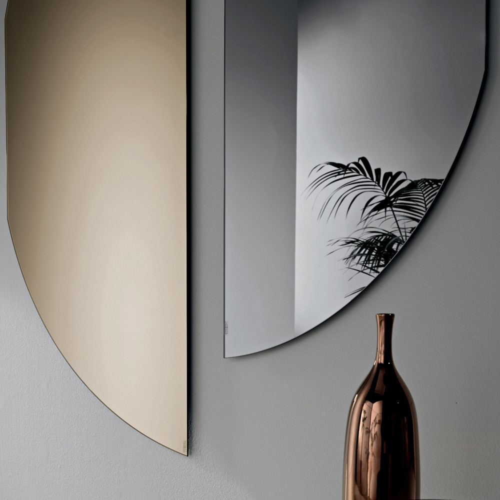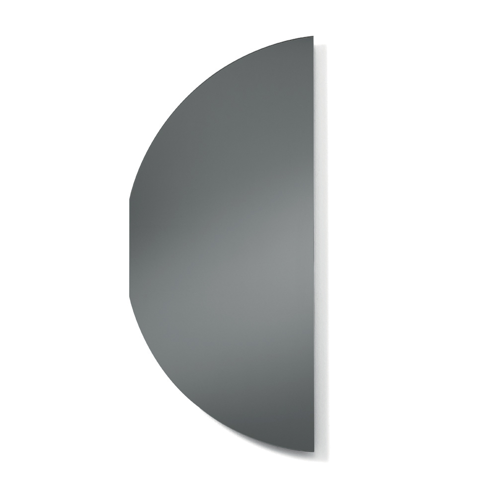 Der Spiegel besticht durch seine geschwungene Form, die an einen Halbkreis mit unterbrochener Kurve erinnert und so eine originelle und harmonische Silhouette erzeugt. Diese essentielle Geometrie verleiht dem Spiegel eine starke visuelle Präsenz und bewahrt gleichzeitig eine minimalistische und elegante Ästhetik.