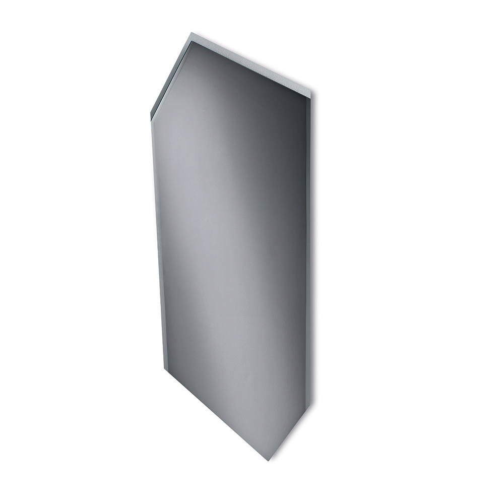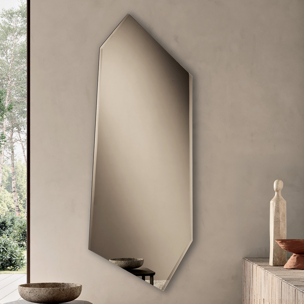 Der Spiegel besticht durch seine unregelmäßige Form, die an ein sechsseitig offenes Rechteck erinnert und so eine moderne und unkonventionelle Silhouette erzeugt. Das Profil ist an vier Seiten mit einer partiellen Facette versehen – ein dezentes, aber wertvolles Detail, das die Konturen betont und die Spiegelfläche zum Strahlen bringt.