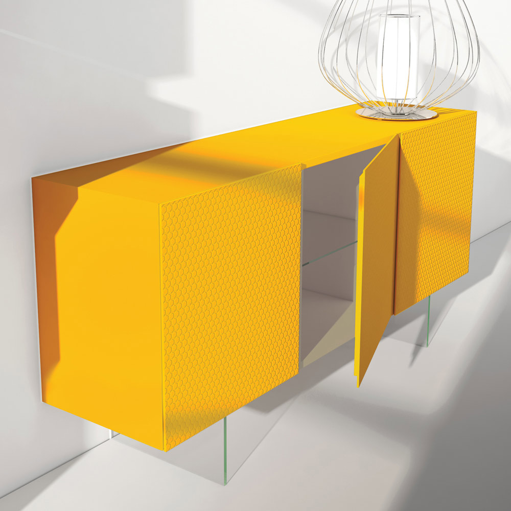 Wohnzimmer-Sideboard mit kanariengelb matt lackierter MDF- Struktur, auch mit extraklaren Glasfüßen . Das Öffnungssystem hat 3 Flügeltüren um perfekte Funktionalität und Praktikabilität zu gewährleisten. Dieses Produkt zeichnet sich durch Geschmack und Design aus, dank der Vereinigung verschiedener Materialien, seiner eleganten und raffinierten Oberflächen und verschönert durch die Dekoration an der Tür, die aus vielen kleinen wabenförmigen HPL-Fliesen besteht . Alle für die Konstruktion verwendeten Materialien bieten eine hohe Qualität und Beständigkeit im Laufe der Zeit und verleihen dem Produkt eine einzigartige und unvergessliche Note.