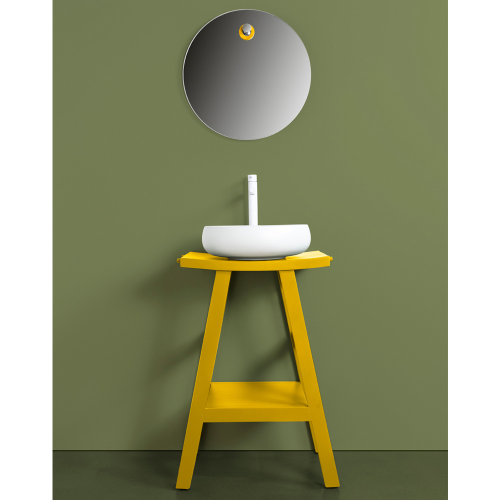 Gelb lackierter Badezimmerschrank aus Teakholz mit Haken und Ablage.
