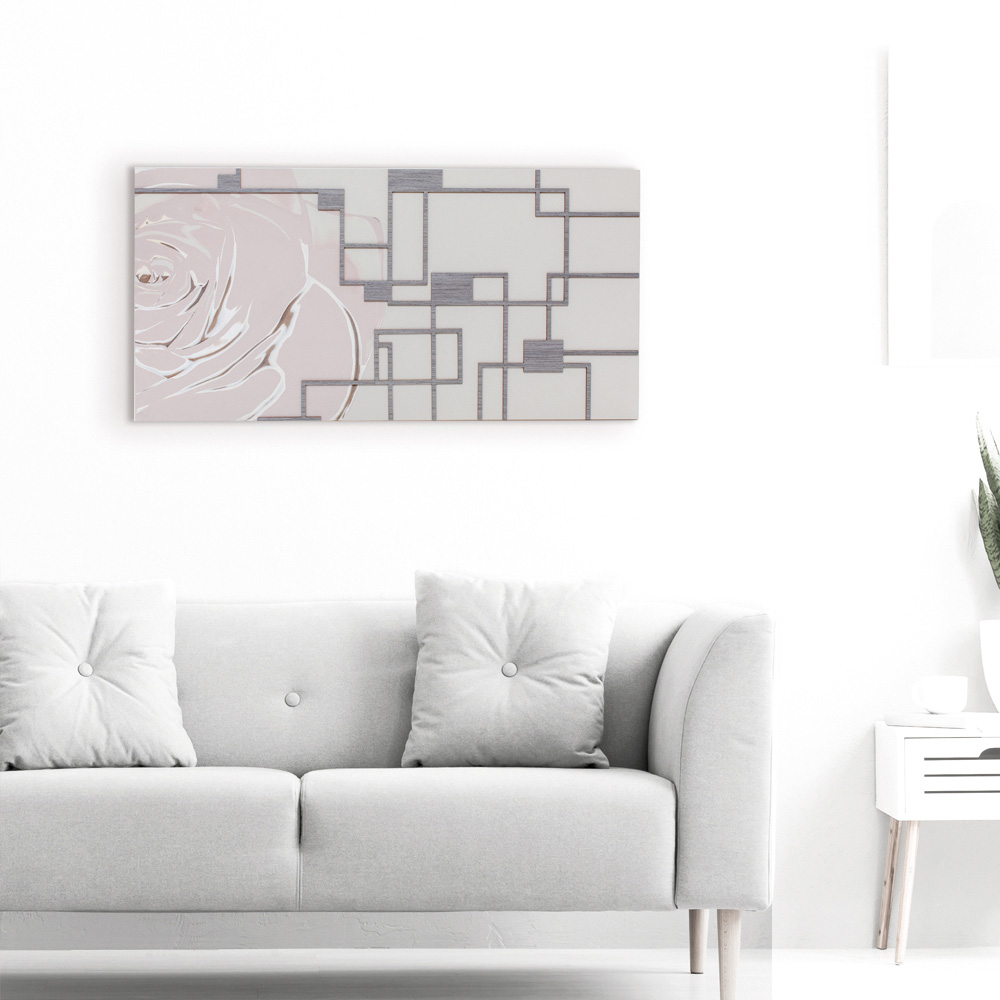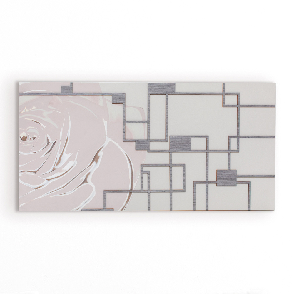 Die dekorative Platte wird mithilfe der Lasermarkierungstechnik hergestellt, die ein Flachrelief auf dem Material erzeugt und verschiedene Farbabstufungen der auf der Platte erzeugten Blütenblätter erzeugt. Das Gestell besteht aus sandlackiertem Holz mit grauen Applikationen. Sanfte Rosatöne spielen mit dem geometrischen Dekor aus grauem Holz.
