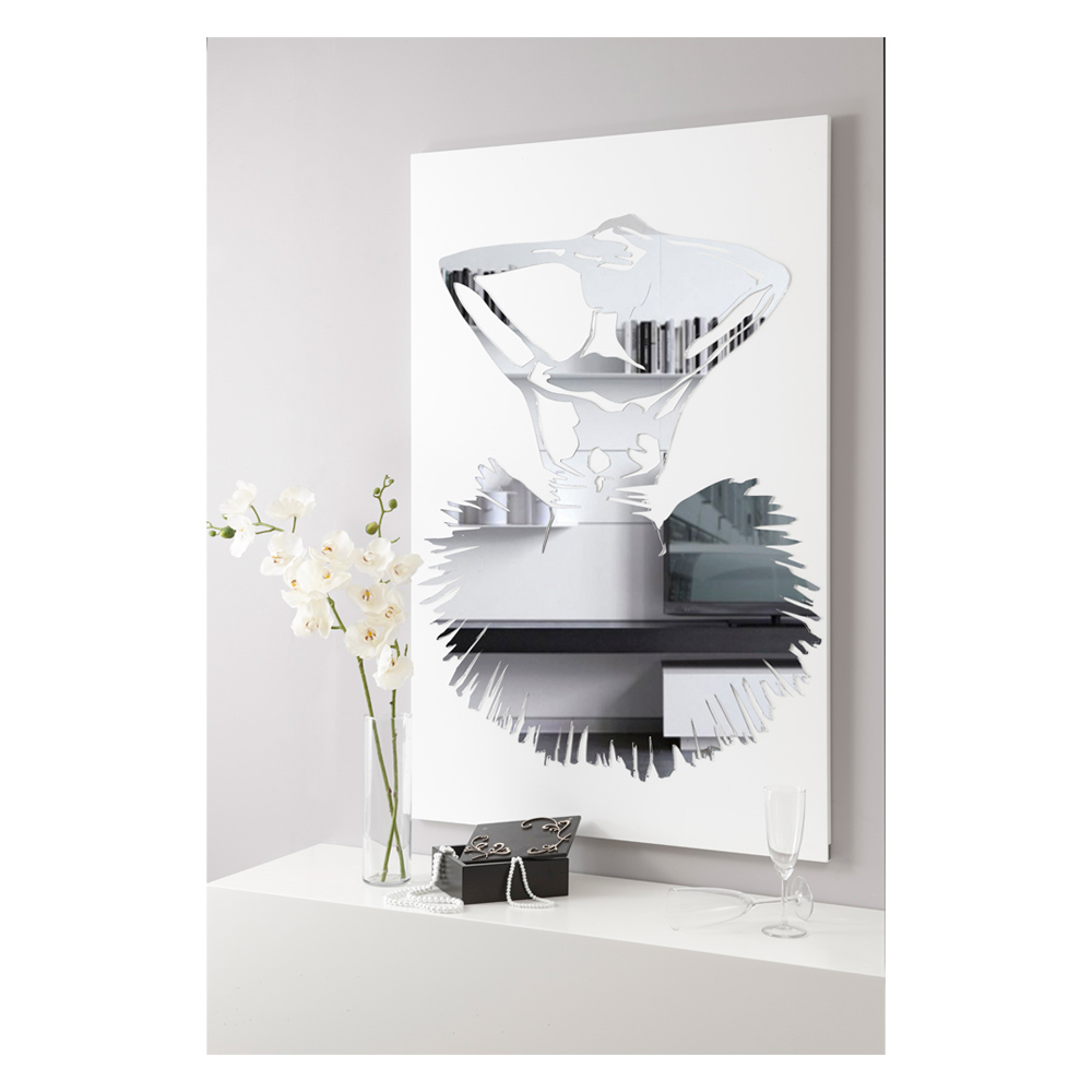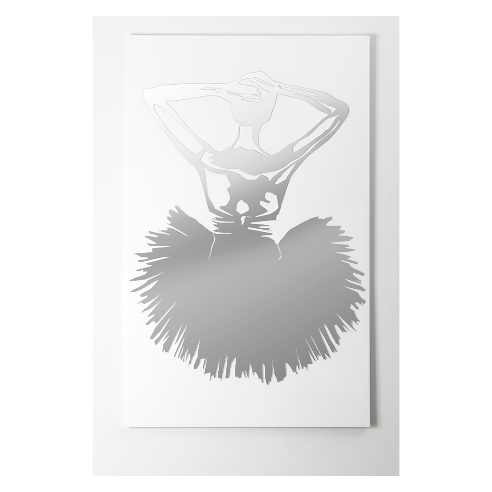 Die Dekorplatte wird mithilfe der Lasermarkierungstechnik hergestellt, die ein Flachrelief auf dem Material erzeugt und so unterschiedliche Farbabstufungen erzeugt. Das Bild besteht aus weiß lackiertem Holz mit Spiegeldekor. Es stellt eine Tänzerin dar, die auf Spiegelplexiglas gefertigt ist, was tatsächlich der Fall ist Funktioniert auch als Spiegel.