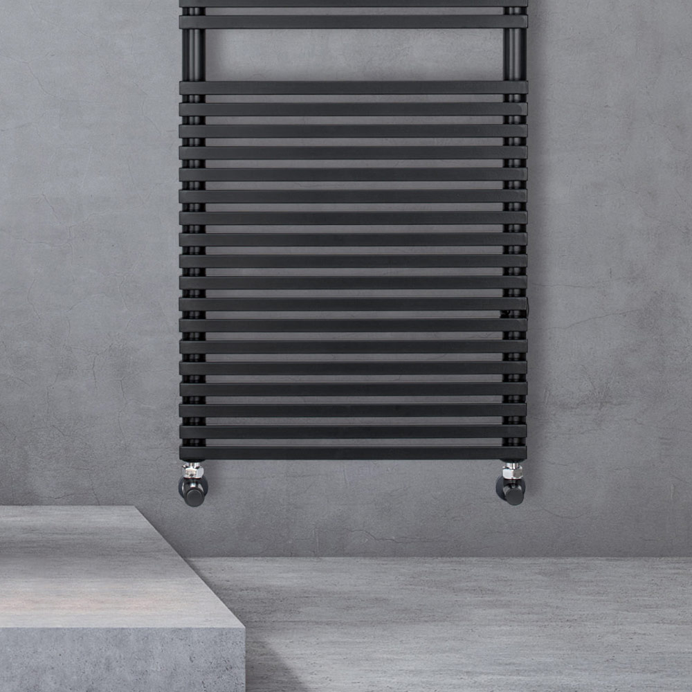 Hybrider beheizter Handtuchhalter aus Kohlenstoffstahl mit tiefschwarzer Oberfläche, bestehend aus einer Reihe horizontaler Elemente mit einem quadratischen Querschnitt von 2 cm, die an vertikale Verteiler mit einem Durchmesser von 3,5 cm geschweißt sind. Komplett in Italien hergestellt, inklusive Wandbefestigungsset, Entlüftungsventil und Blindstopfen .