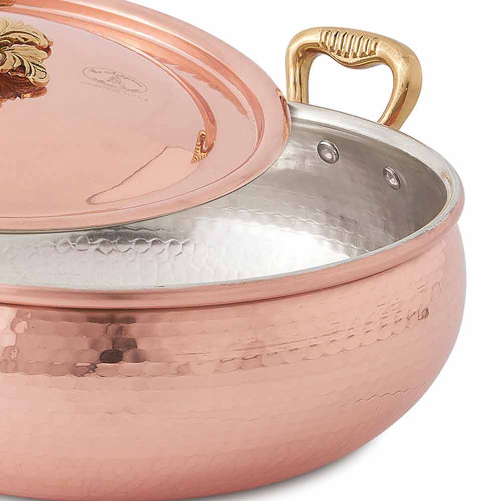 Abgerundete Gemüseschale aus gehämmertem Kupfer mit Griffen und Deckel, handgefertigtes Design made in Italy.