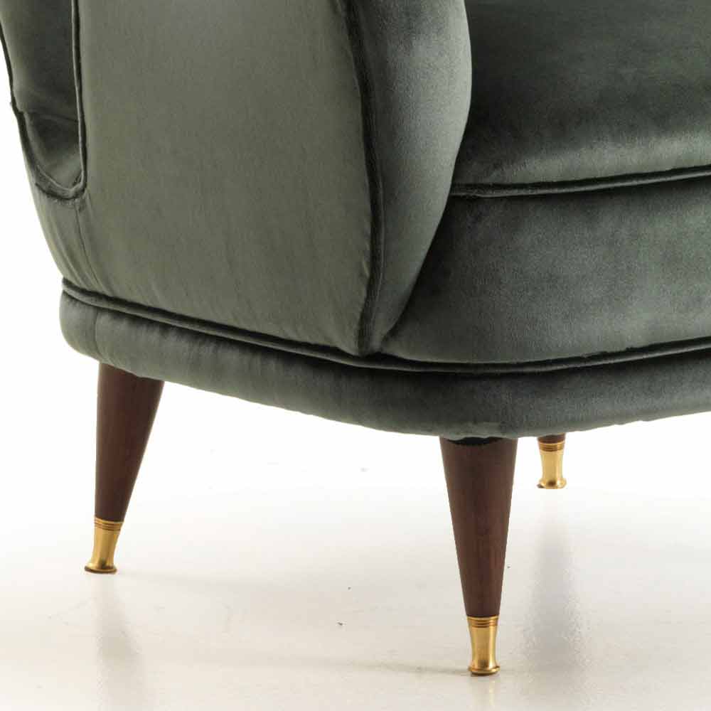 Gepolsterter Sessel mit patinierten Messingspitzen. Benny ist von den Zimmer-Sesseln der Vergangenheit inspiriert, aus denen er die gewundenen und sinnlichen Formen und die dünnen und sich verjüngenden Holzfüße entlehnt hat. Das in reduzierter Höhe platzierte Sitzkissen besteht aus einer dicken Polsterung sowie der hohen und breiten Rückenlehne und den beiden Armlehnen für ein außergewöhnliches Komfortgefühl. Die Form des Rückens erinnert an die Proportionen sehr weibliche Kurven, die eine dünne Taille, die sich nach oben erweitert. Finish in dunklem amerikanischem Nussbaum.