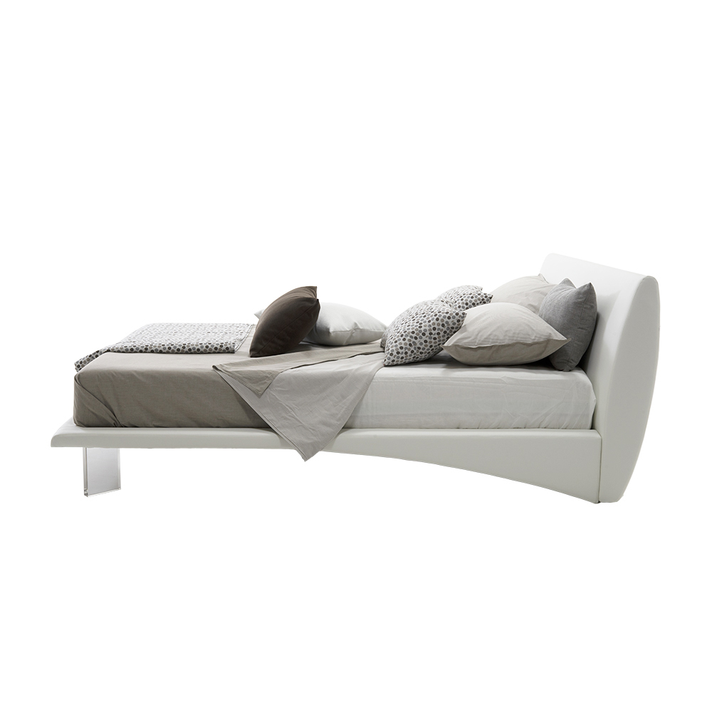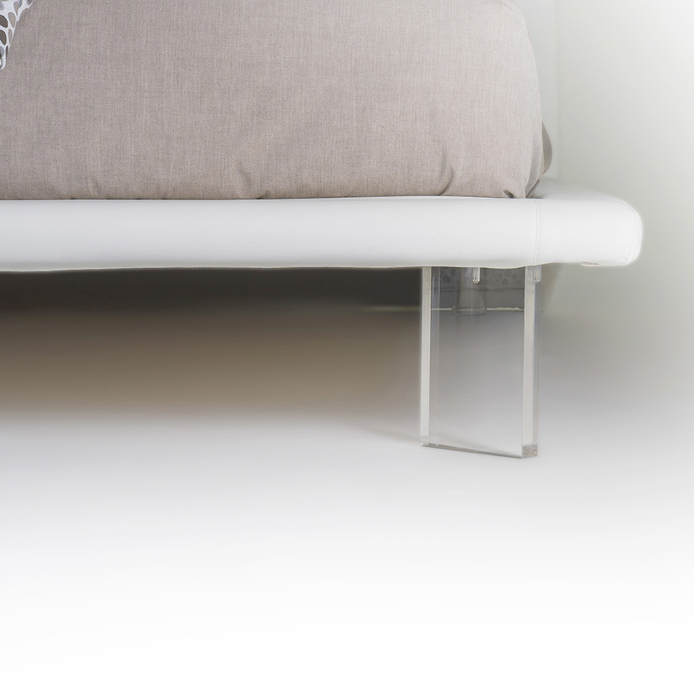 Besondere Merkmale sind die doppelte Umfangsnähte des Kopfteils und des Bettrahmens sowie die Plexiglasfüße, die den schwebenden Effekt erzeugen.