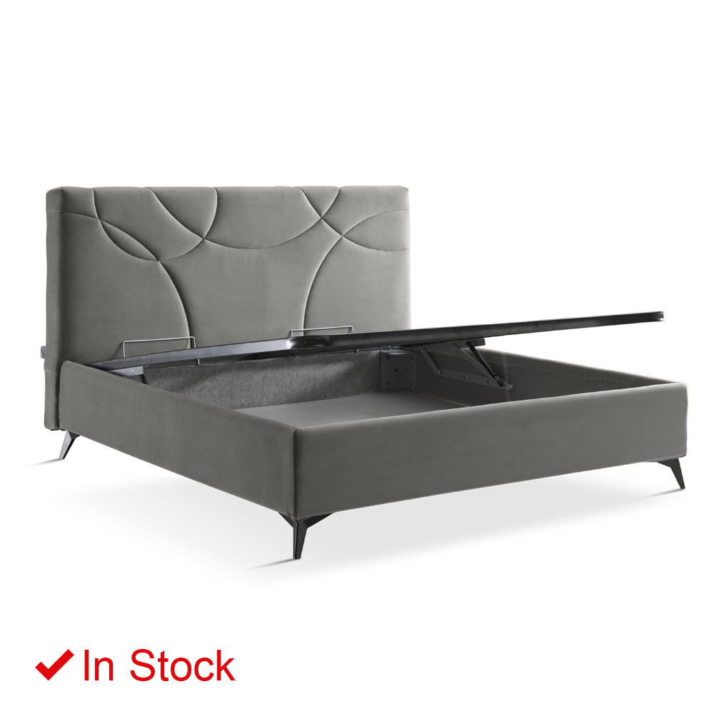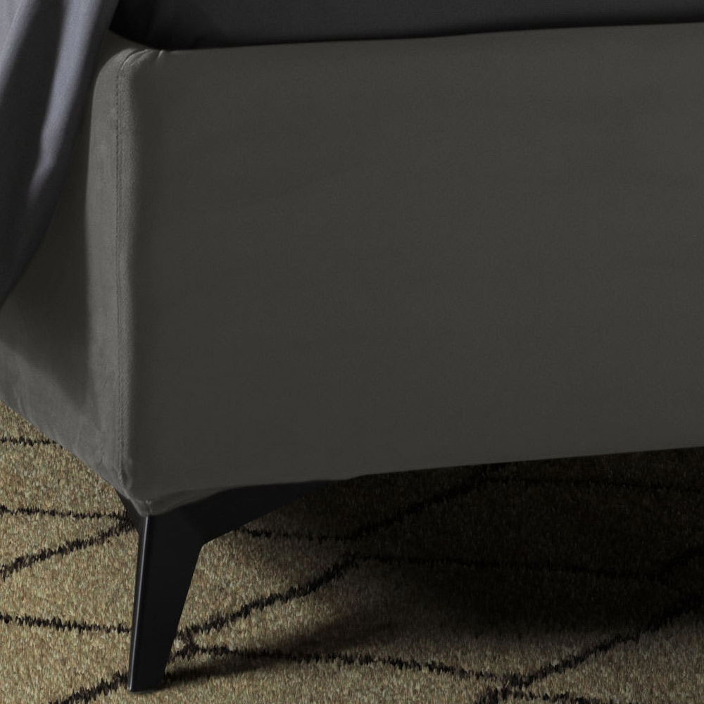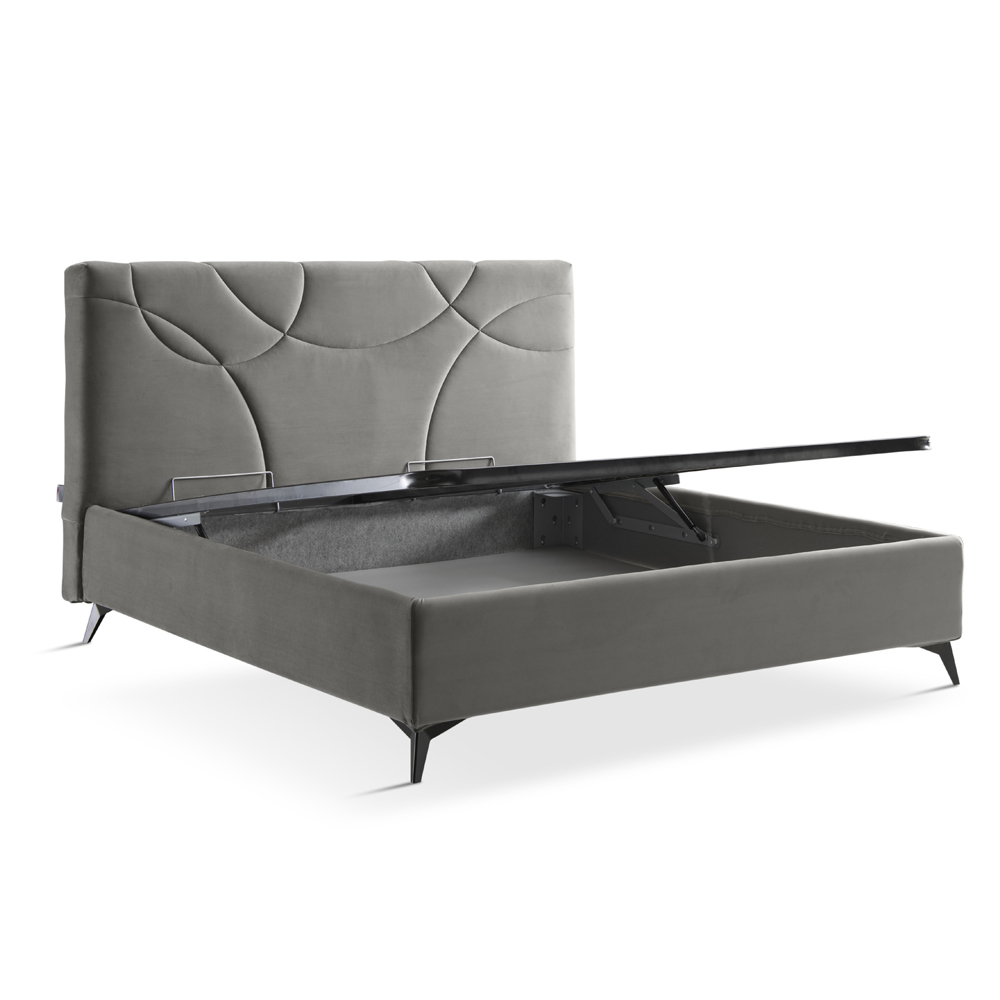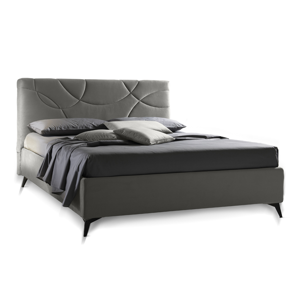 Doppelbett komplett in Italien hergestellt, mit vollständig abnehmbarem gepolstertem Bettrahmen und mit Stoff oder Samt bezogenem Kopfteil, 160 x 190 cm orthopädischer Basis und anthrazitfarbenen Metallfüßen (H. 13,5 cm). Eine Einrichtungslösung, die allen Bedürfnissen gerecht wird und maximalen Komfort zusammen mit einem schlichten und eleganten Design bietet.