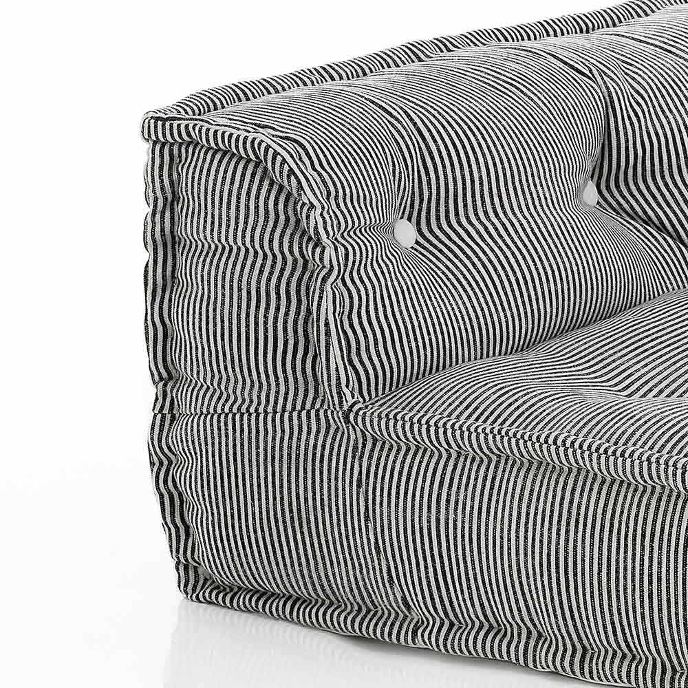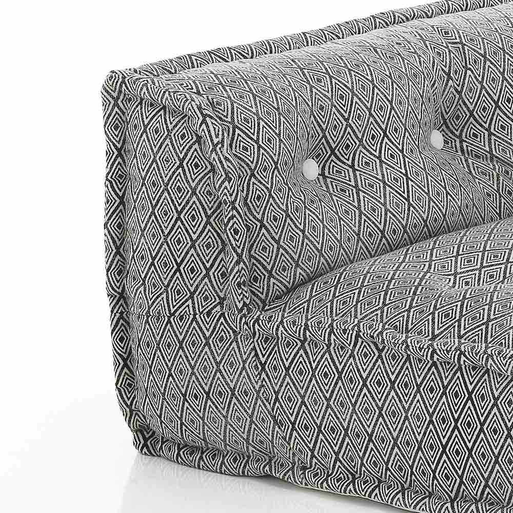 Gepolstertes Sofa aus Patchworkstoff und schwarz oder weiß lackiertem Holz mit ethnischem Design.