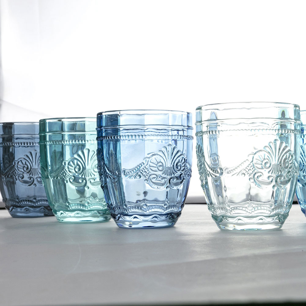 Farbige und elegante Gläser im Glasservice von 12 Stück für Wasser.