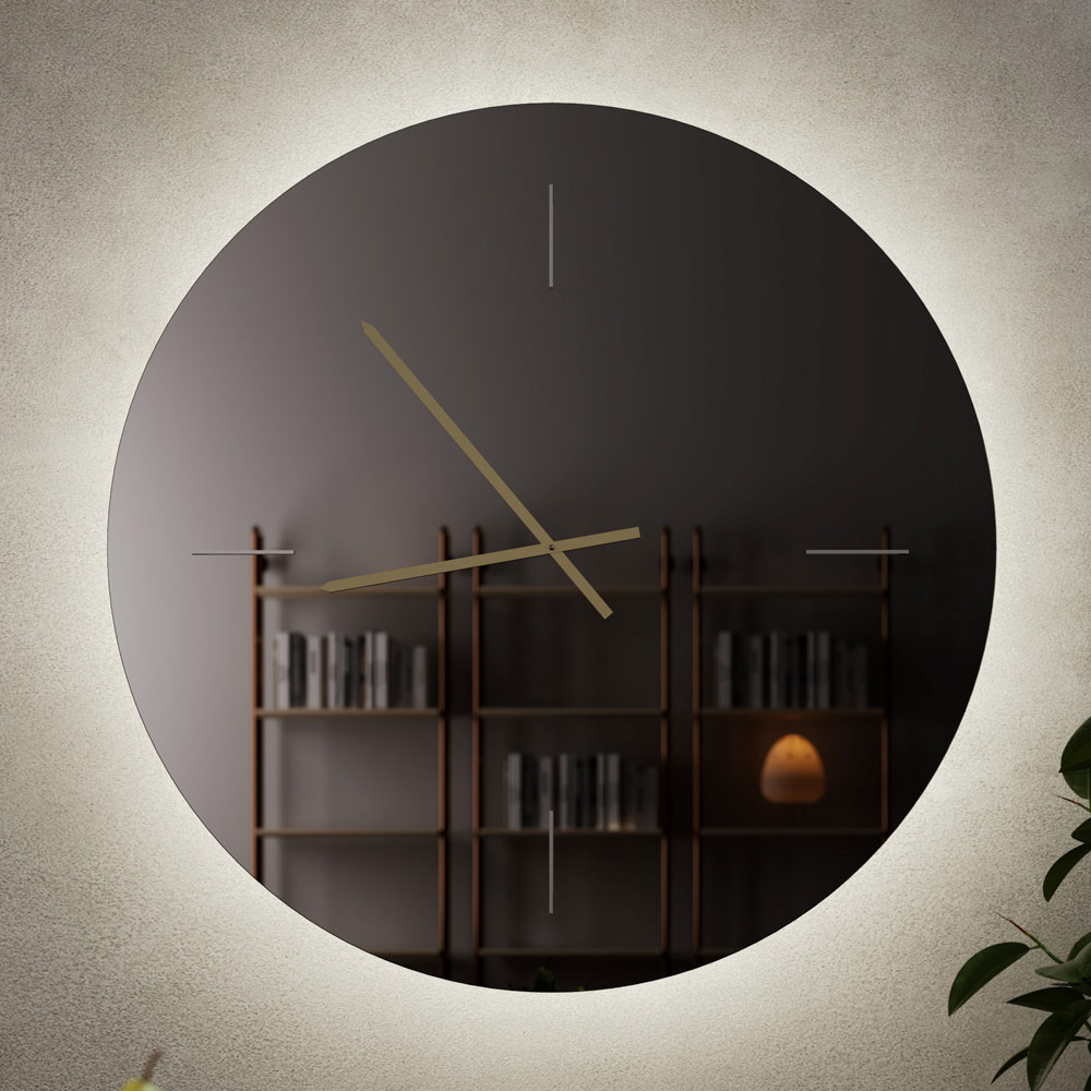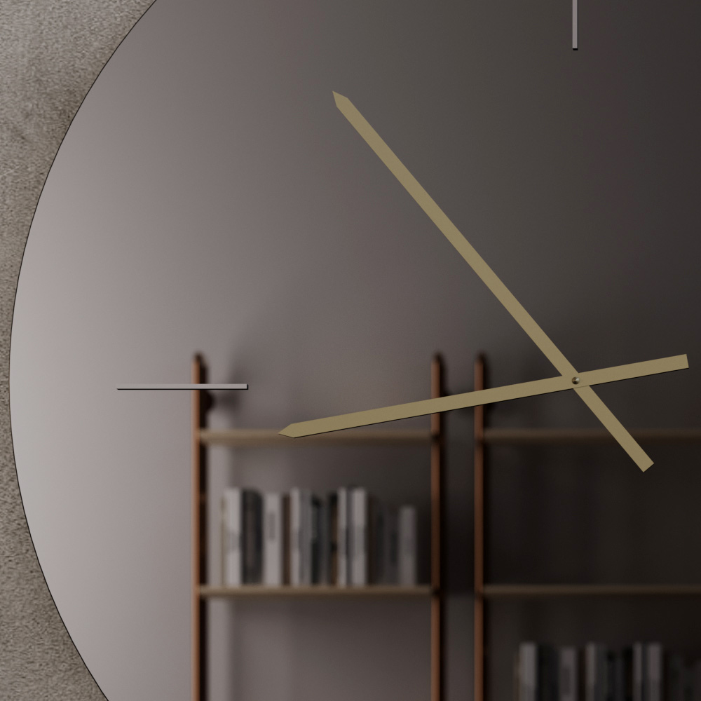 Die schlanken, minimalistischen Zeiger aus satiniertem Messing heben sich elegant vom rauchfarbenen Hintergrund ab und erzeugen einen raffinierten und harmonischen Kontrast. Das schlichte Design ohne überflüssige Elemente macht diese Uhr zu einem wahren Dekorationsobjekt, das moderne Wohnzimmer, Esszimmer, Büros und Geschäftsräume gleichermaßen aufwertet.
