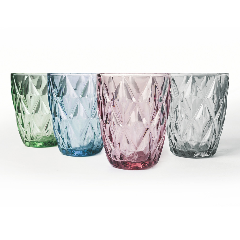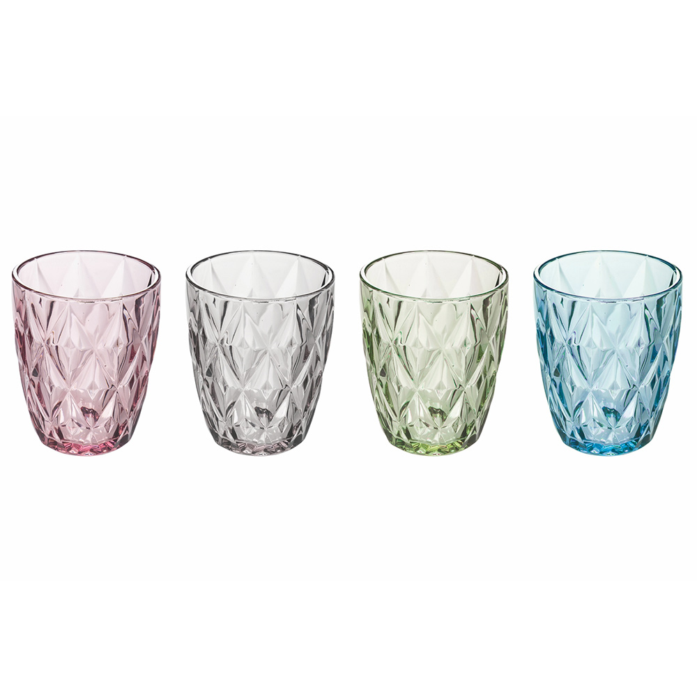 Set aus farbigen Glaswassergläsern mit Schnitzereien, 12-teilig.