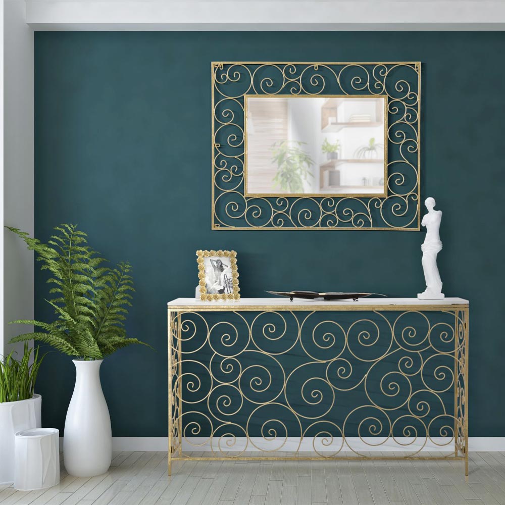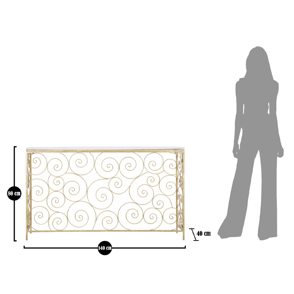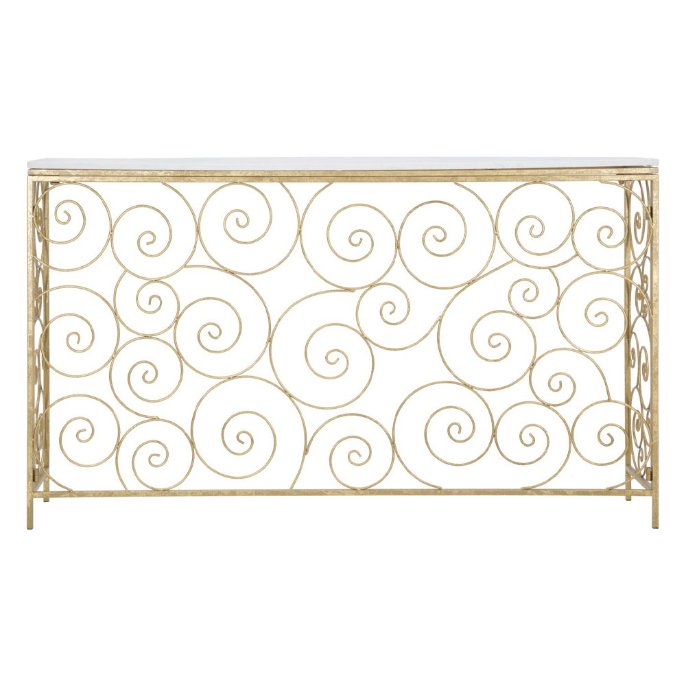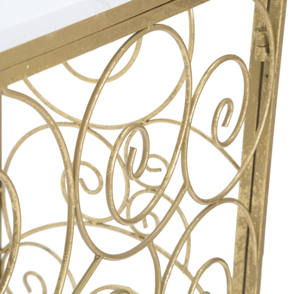 Eingangskonsole aus goldfarbenem Eisen und weißem Marmor.