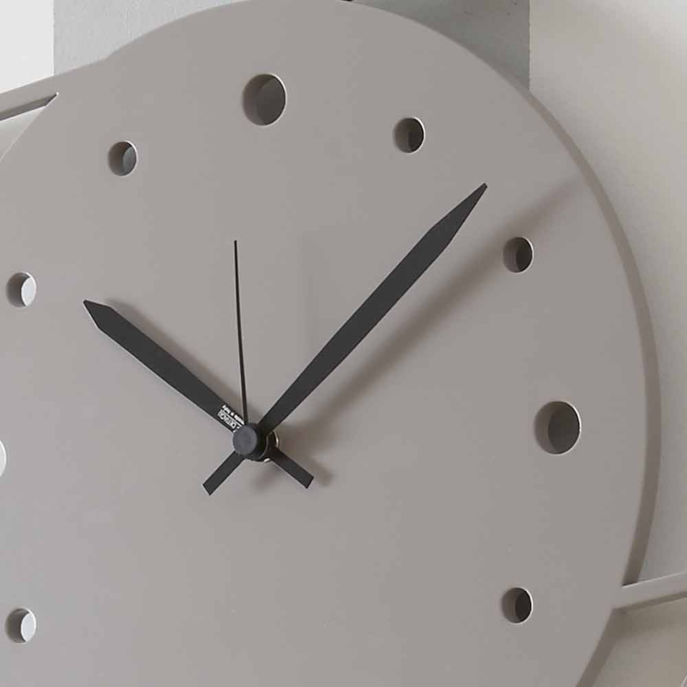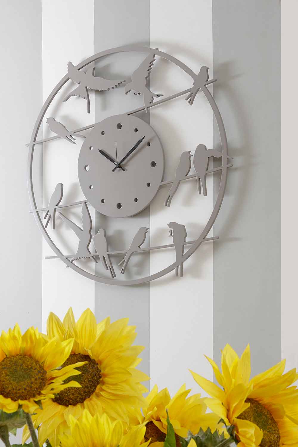 Große und originelle Wanduhr, rundes und modernes Design mit Vögeln, aus weißem, taupefarbenem oder grauem Holz, hergestellt in Italien.