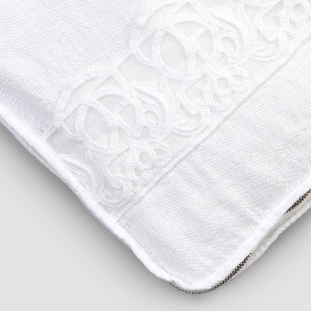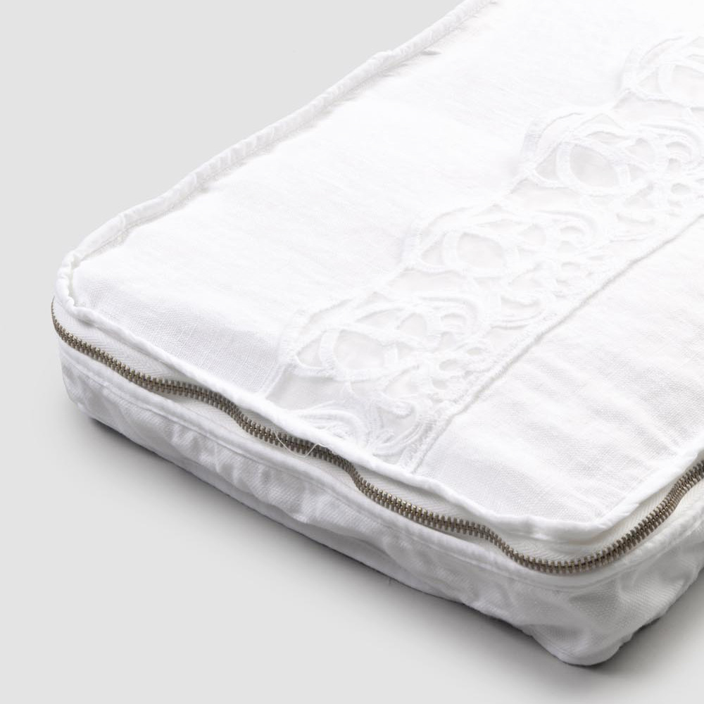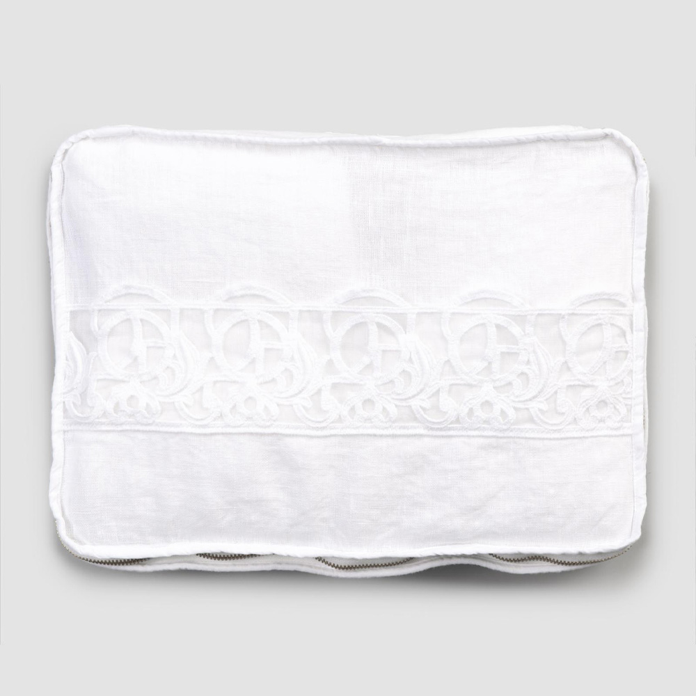 Der Wert der Tradition verbindet den modernen Lebensstil mit dieser großen rechteckigen Kosmetiktasche aus weißem Leinen und Baumwolle mit Synergiespitze und Reißverschluss.