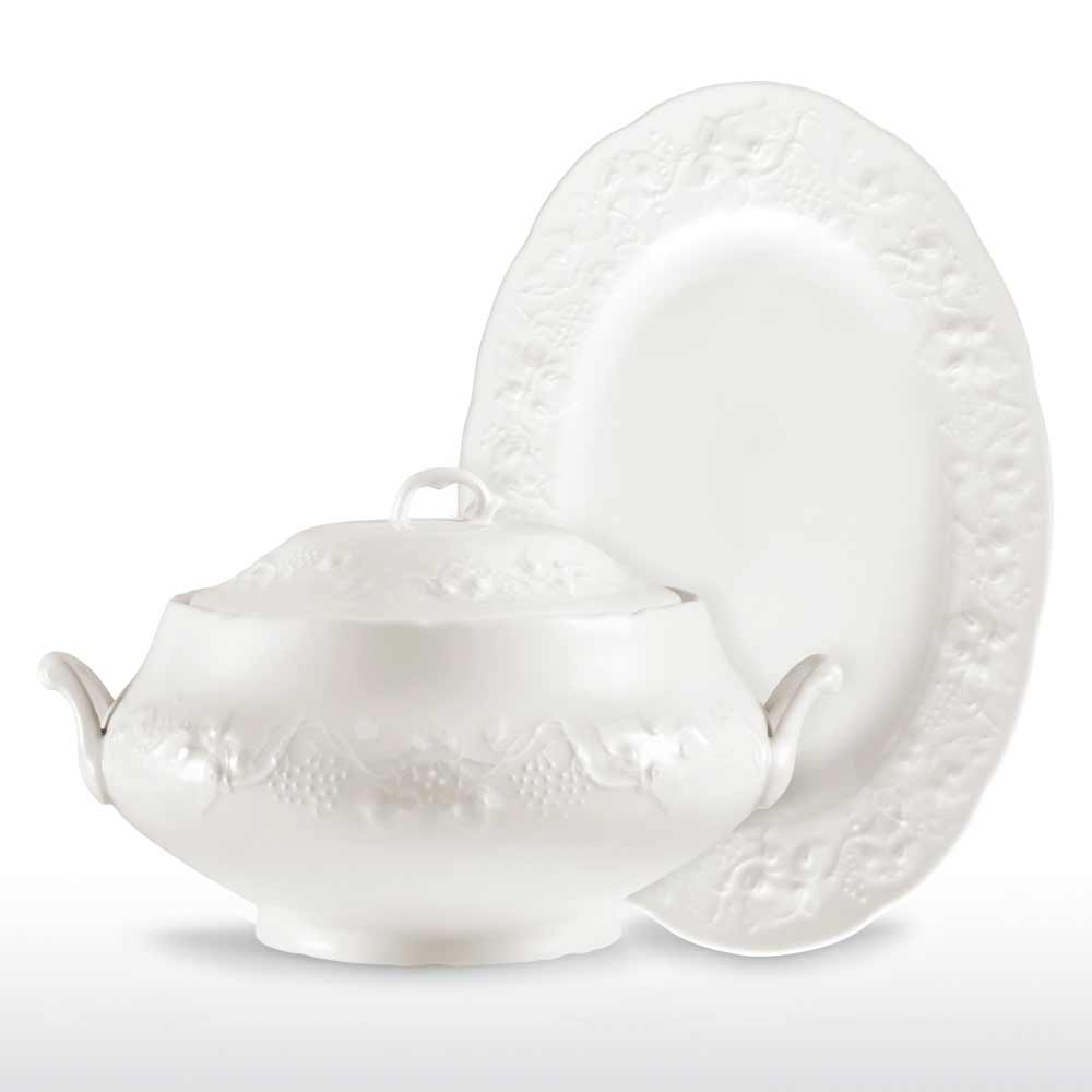 Große elegante und raffinierte Suppenterrine und ovales Serviertablett aus weißem Porzellan, 2 Stück.