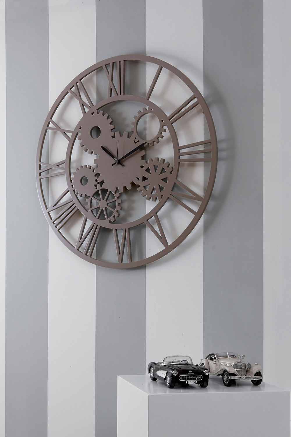 Große Wanduhr im schäbigen Stil, rundes Design in weißem, grauem oder taupefarbenem Holz, hergestellt in Italien.