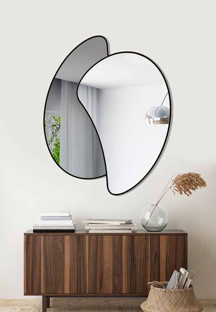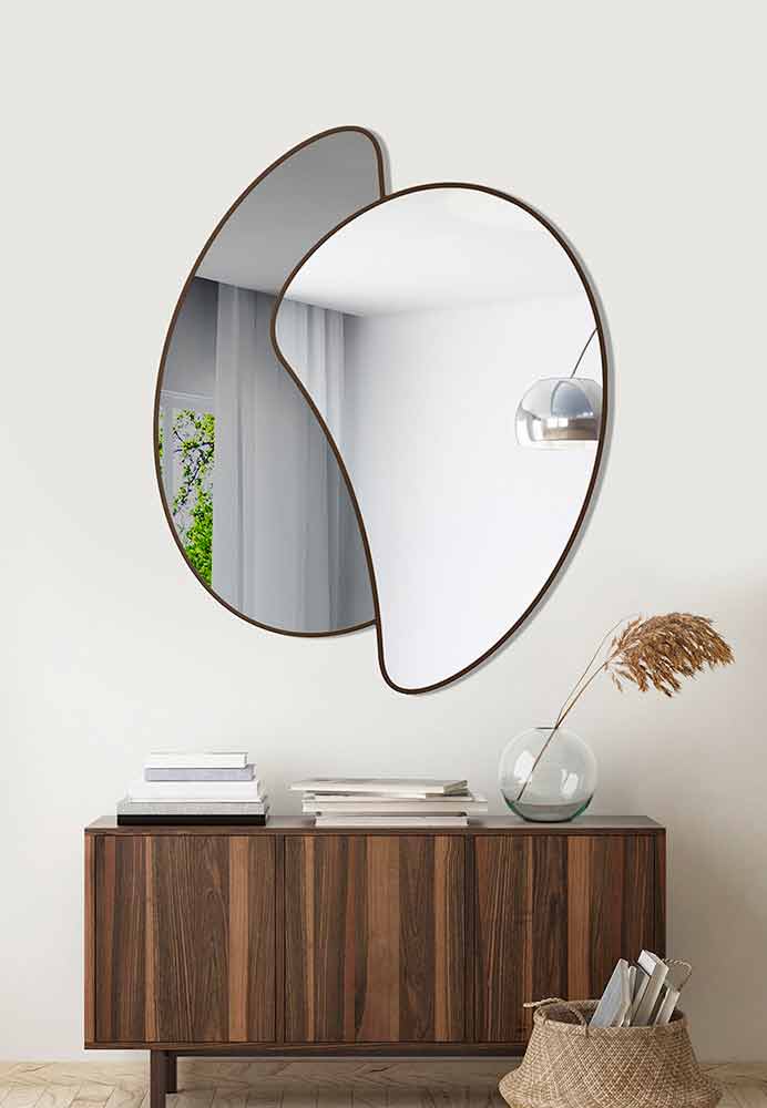 Wandspiegel besteht aus zwei Spiegeln, von denen einer eine rauchige Farbe hat, mit eleganten Linien und modernen Formen kombiniert mit raffinierten lackierten Oberflächen für ein Ergebnis mit minimaler und dekorativer ästhetischer Wirkung in einem einzigartigen Stil.