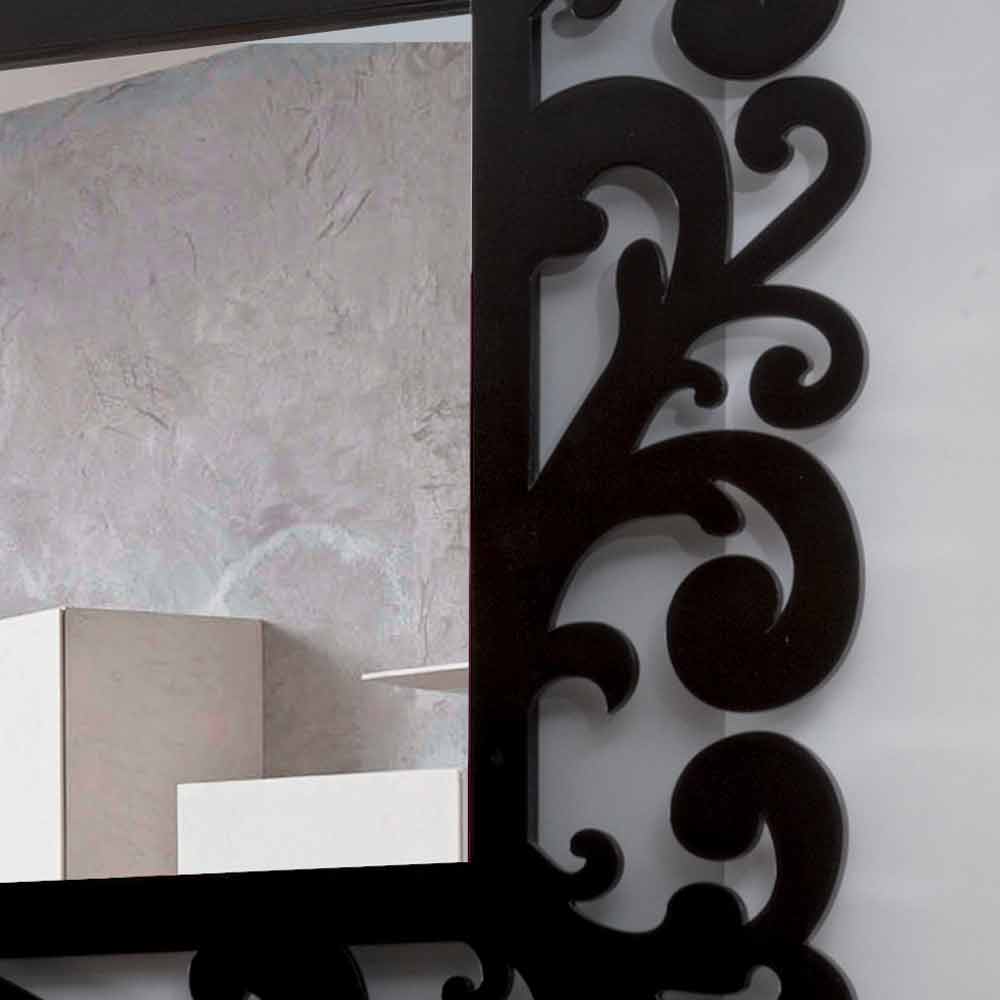 Polierter schwarzer Holzspiegel mit rechteckigem Wanddesign mit dekoriertem Rahmen, hergestellt in Italien.