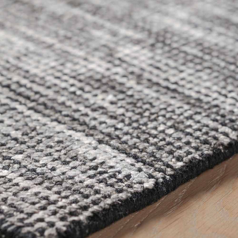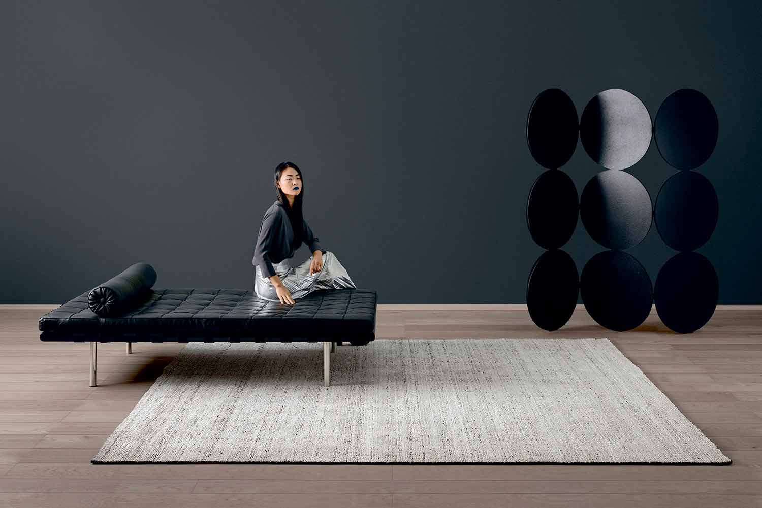 Moderner Designteppich aus Seide, Baumwolle und Wolle in verschiedenen Farben und zwei verschiedenen Dimensionen mit unregelmäßiger Oberfläche.