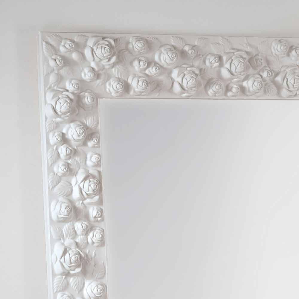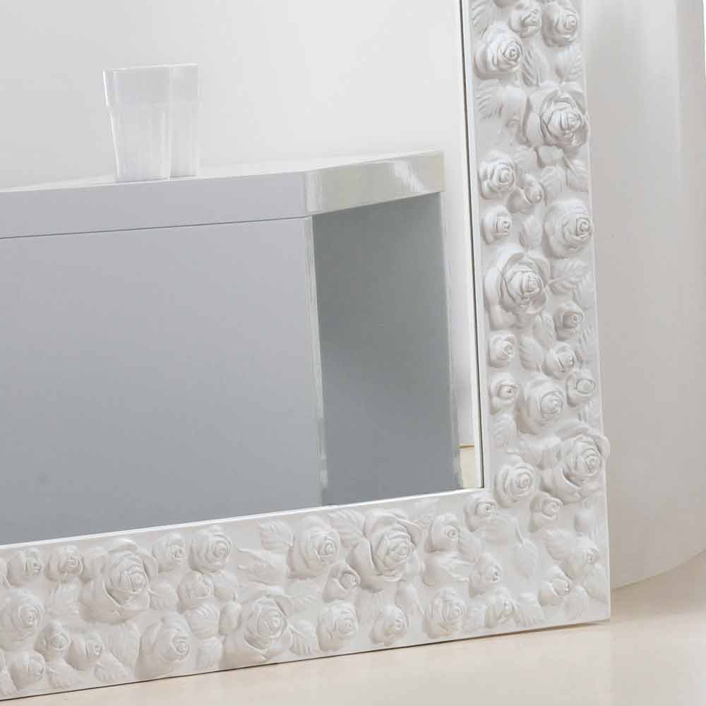 Die Breite des Rahmens beträgt 14,5 cm, bei einer maximalen Dicke von 6 cm an der maximalen Stelle des Reliefs der Rosen. Satinweißes Finish. Kristallspiegel, 4mm dick. Hergestellt in Italien. Die verwendeten Farben bestehen aus einer Grundierung auf Wasserbasis und einer Acrylbeschichtung. Zum vertikalen und horizontalen Aufhängen. Lieferung mit Haken zur Wandmontage.