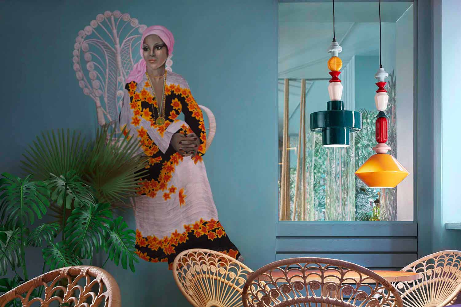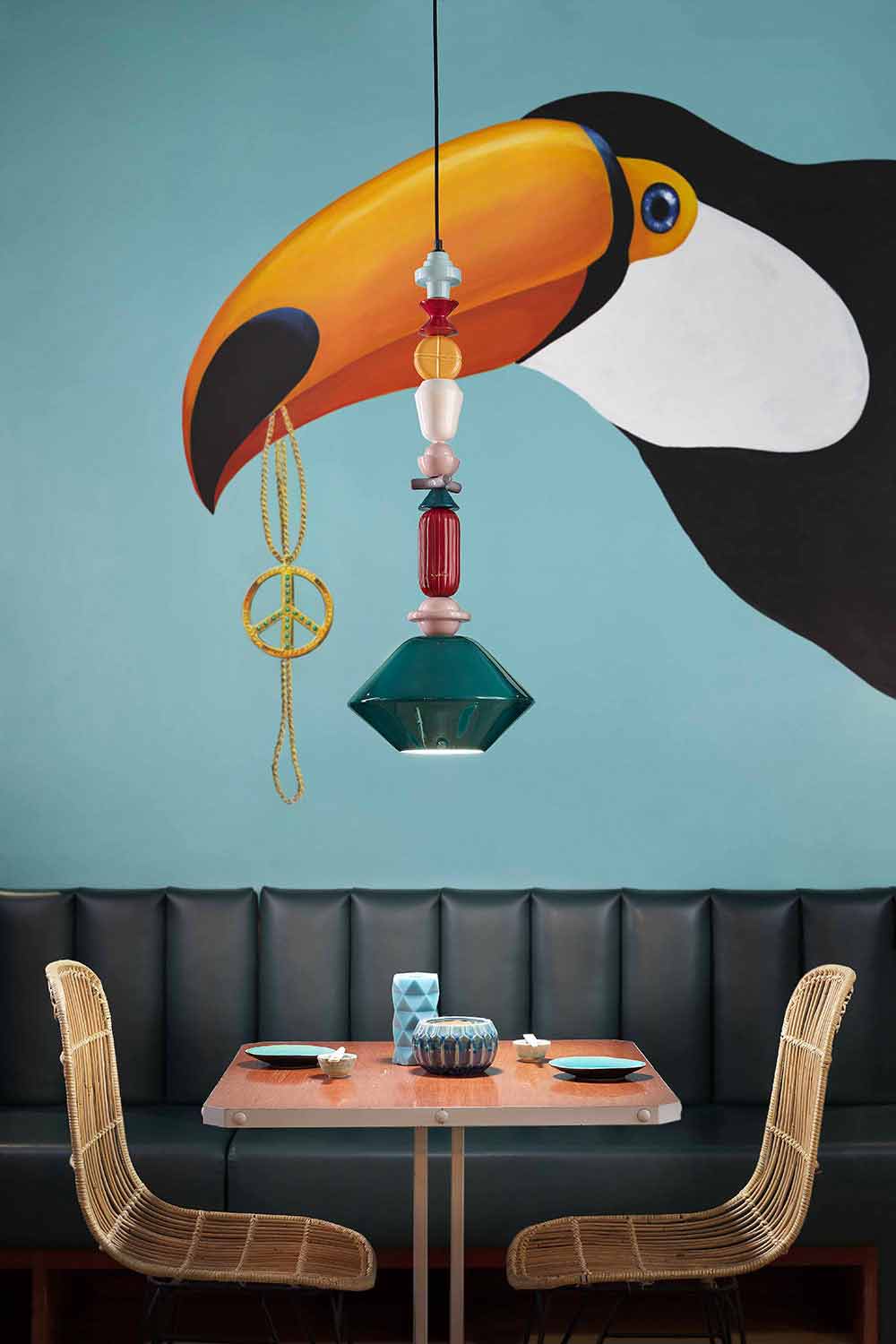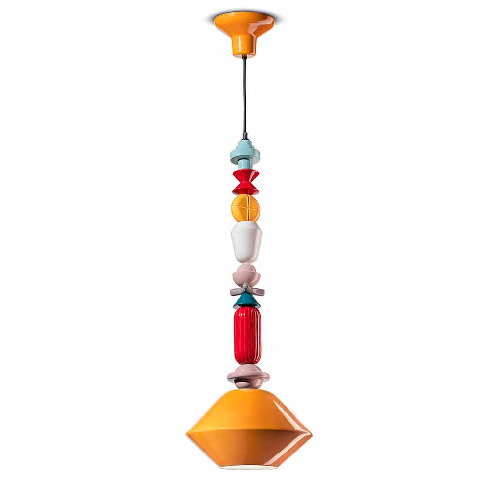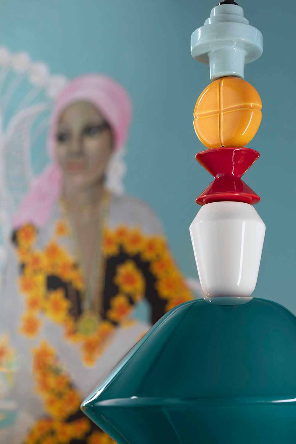 Lariat ist eine einzigartige und besondere Wiedergabe der mehrfarbigen Keramikelemente, die vertikal bis zum zentralen Diffusor aufeinander folgen.
