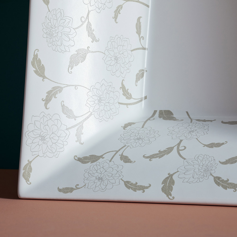 - Innendekor mit Blumenrelief auf mattweißer Emaille, außen mattweißes Email