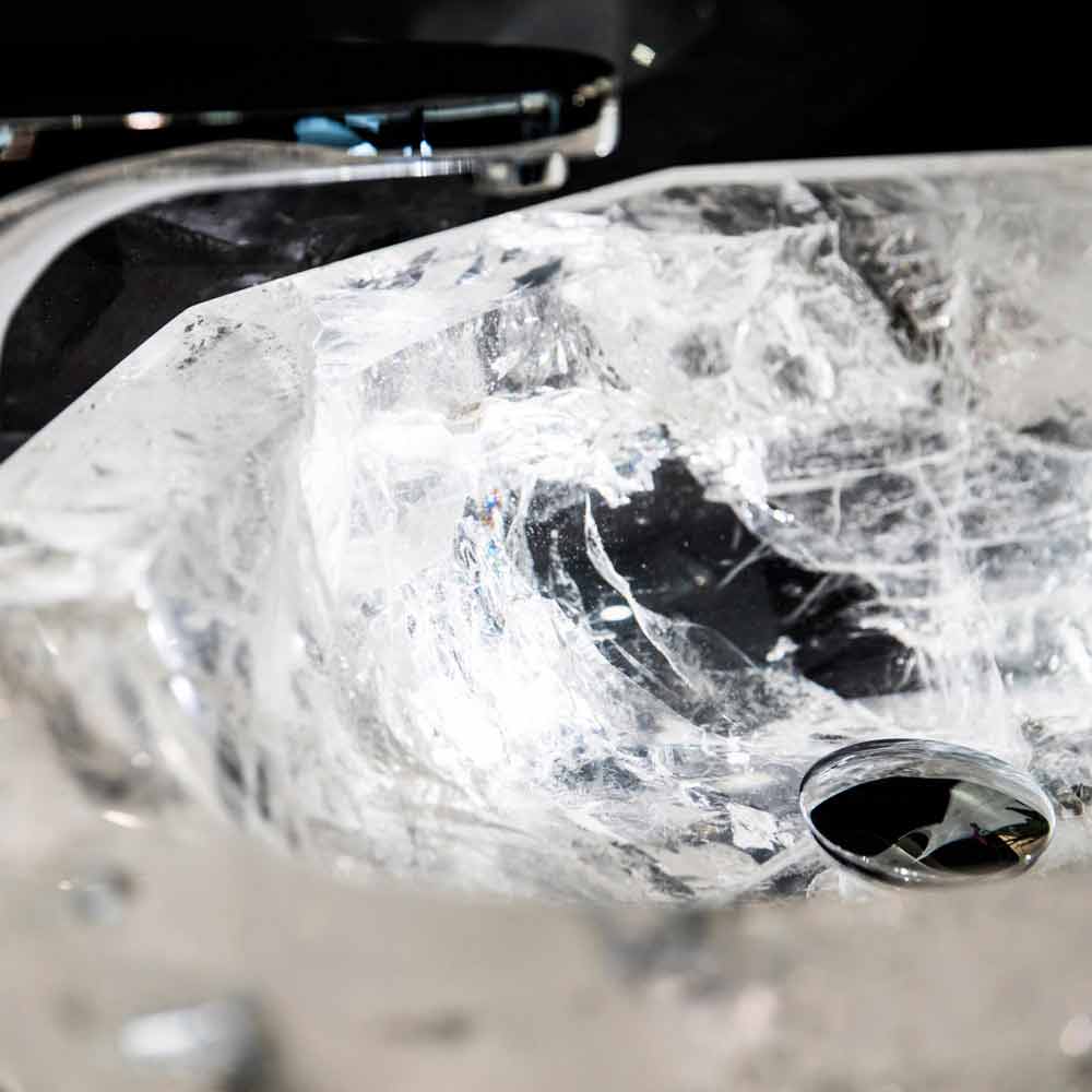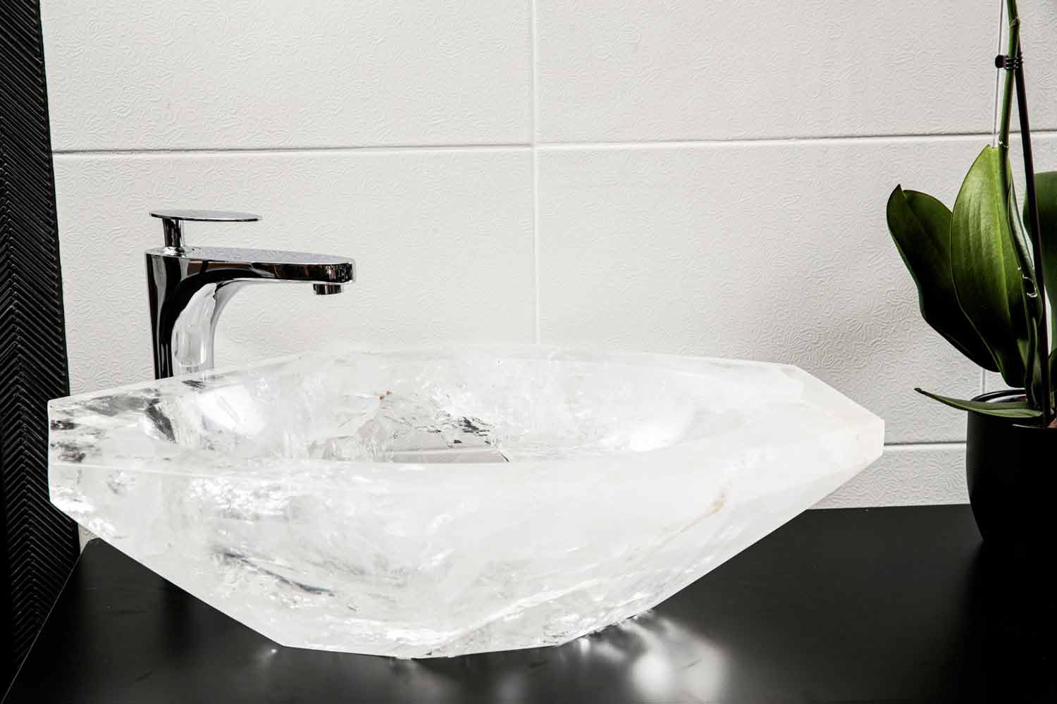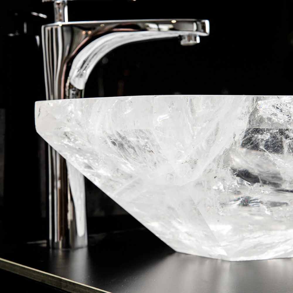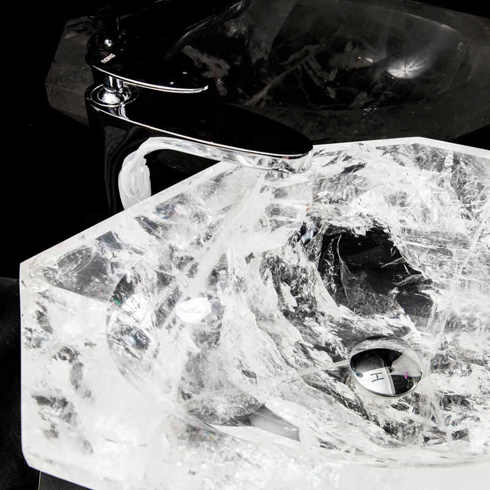 handgefertigtes Waschbecken aus einem Stück Bergkristall. Das Finish ist transparent.