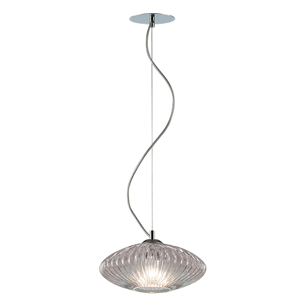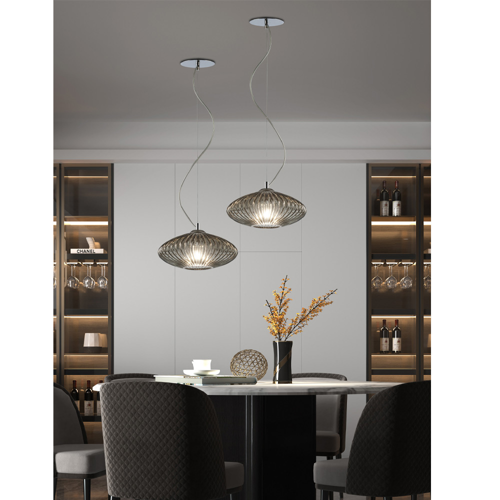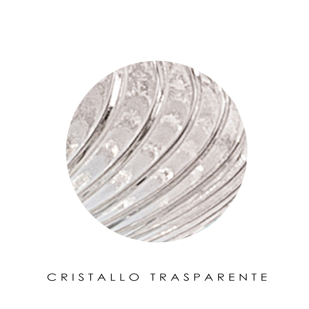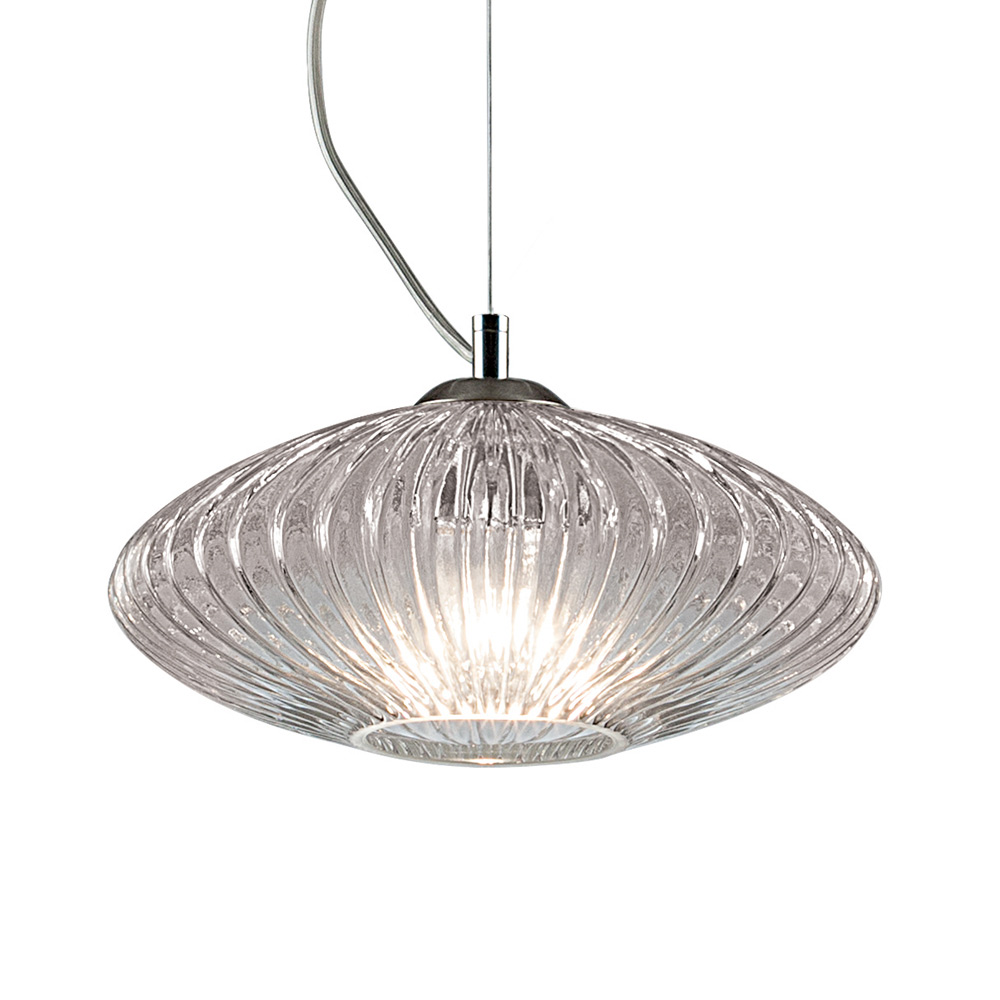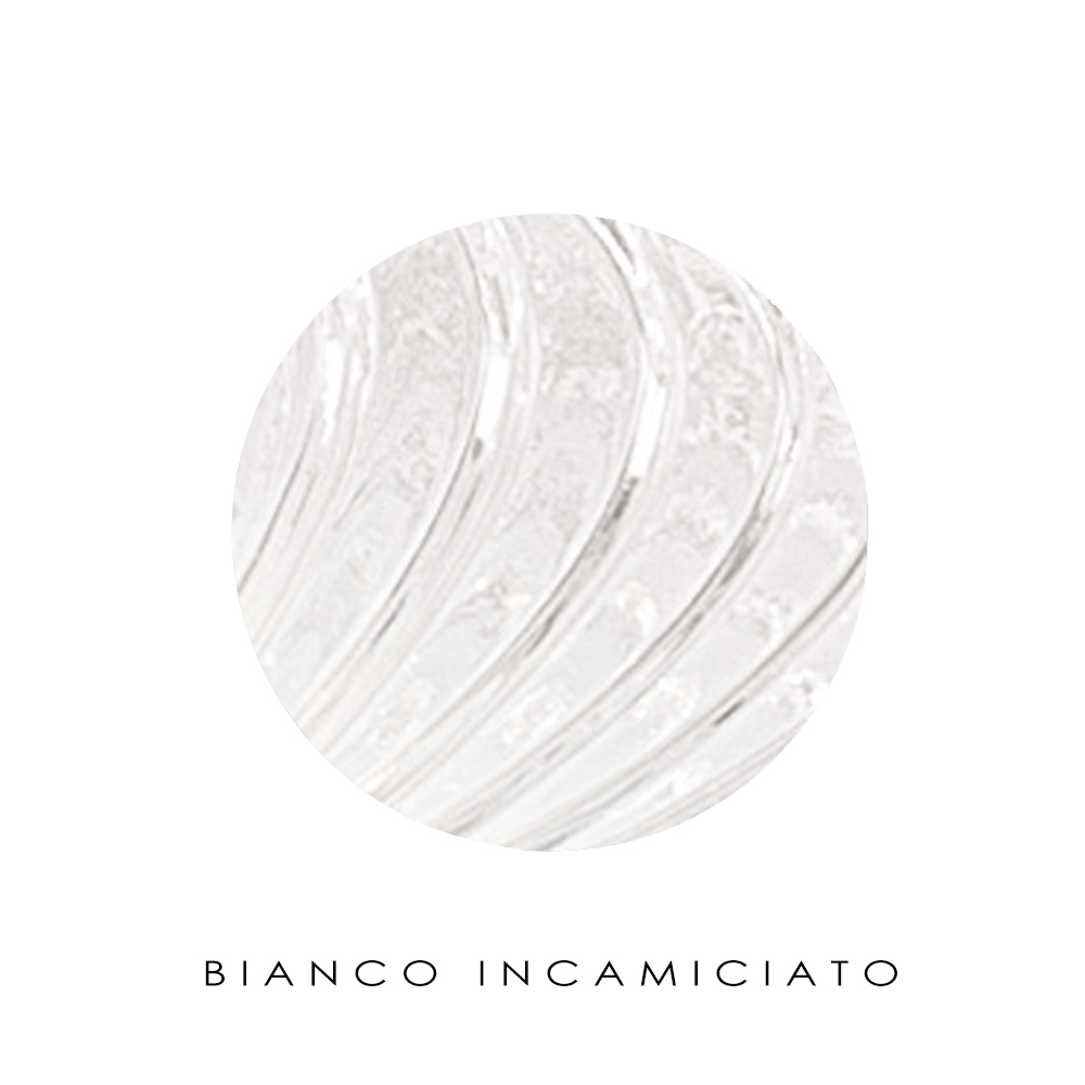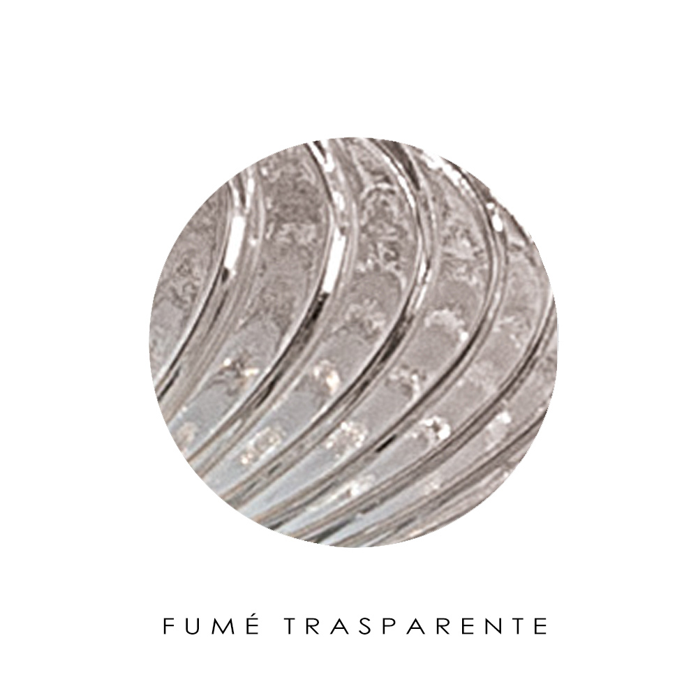 Ein Juwel der Raffinesse und Eleganz aus überzogenem oder transparentem Glas, das mit einer gerippten Verarbeitung versehen ist, um einen starken visuellen Effekt und beispiellose Lichtspiele in jedem Wohn- oder Objektbereich zu erzeugen.