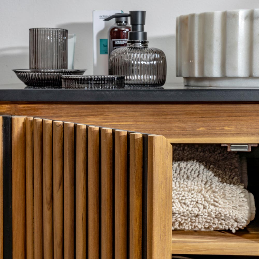 Renovieren Sie Ihr Badezimmer mit diesem Schrank aus massivem Teakholz und Mahagoni , ein Ausdruck von Luxus und Langlebigkeit . Das lineare und geometrische Design der Teakholzlatten wechselt sich harmonisch mit der Wärme des Mahagoni ab und schafft so ein ebenso funktionales wie ästhetisch ansprechendes Einrichtungsaccessoire. Es ist in zwei vielseitigen Größen erhältlich und gewährleistet so eine perfekte Anpassung an große und intime Räume. Es bietet außerdem sanft schließende Türen , die einen Hauch von Luxus und Zweckmäßigkeit verleihen. Das Design ermöglicht die Installation eines oder mehrerer Waschbecken und sorgt so für Flexibilität und individuelle Gestaltung Ihres Badezimmers. Mit seiner raffinierten Verarbeitung und den klaren Linien ist es die ideale Ergänzung für alle, die kompromisslose Funktionalität, Stil und Qualität suchen.