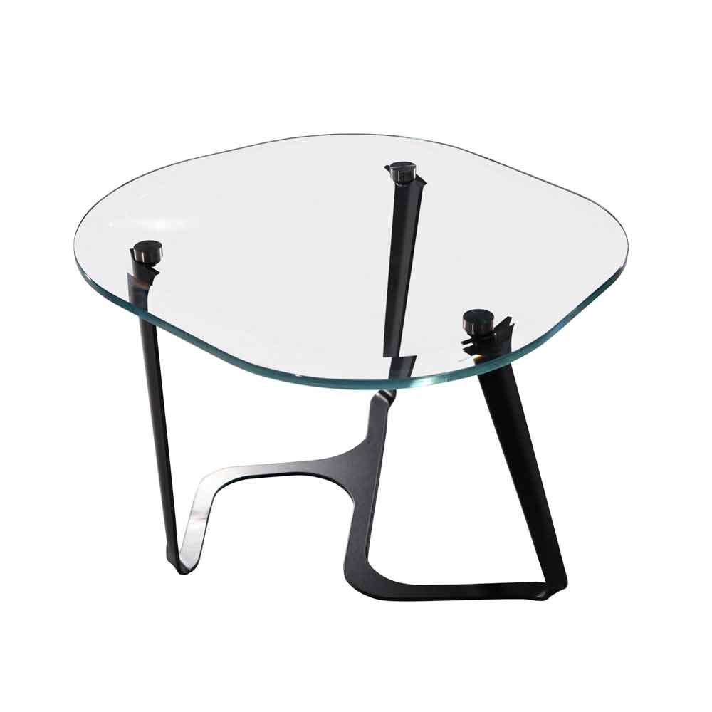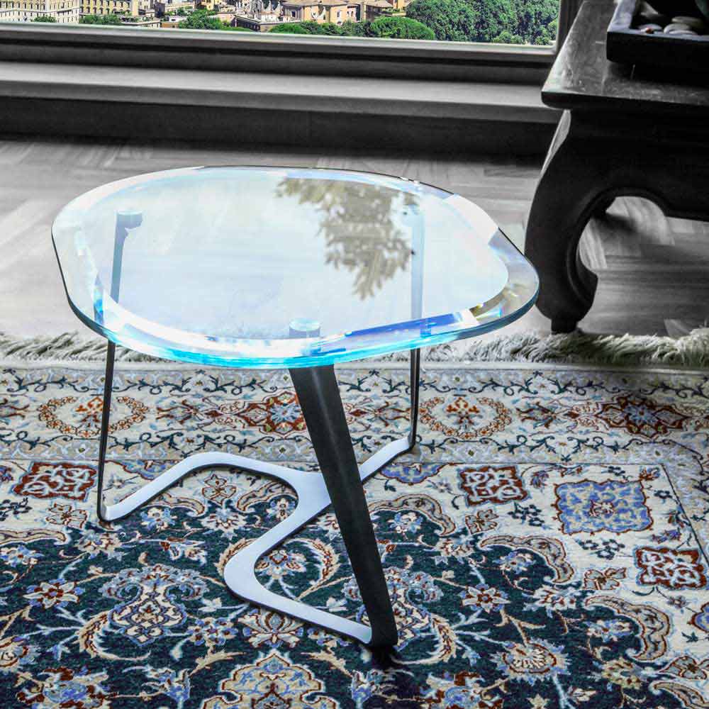Originelle Formen und Materialien von intrinsischer Eleganz erwecken ein revolutionäres Möbelstück zum Leben, das für diejenigen geschaffen wurde, die einen unvorhersehbaren und völlig innovativen Stil lieben. Die dünnen und zarten Linien der Stahlkonstruktion folgen unregelmäßigen und einzigartigen Merkmalen, die eine solide Unterstützung für den Couchtisch darstellen. Die Oberseite ist zart darauf platziert, sehr rein und ultraklar, deren Brillanz an die eines echten kostbaren Diamanten erinnert, auf dem das Licht gleitet und wundervolle Kontrastspiele erzeugt. Die Wahl der Verwendung wertvoller Rohstoffe, die von Hand mit viel Liebe zum Detail verarbeitet wurden, ermöglicht die Schaffung eines exzentrischen Couchtischs, der Design und Funktionalität kombiniert und gleichzeitig einen widerstandsfähigen Tisch, eine praktische Tischplatte und gleichzeitig ein originelles Dekorationselement gewährleistet Element für Ihr Wohnzimmer.