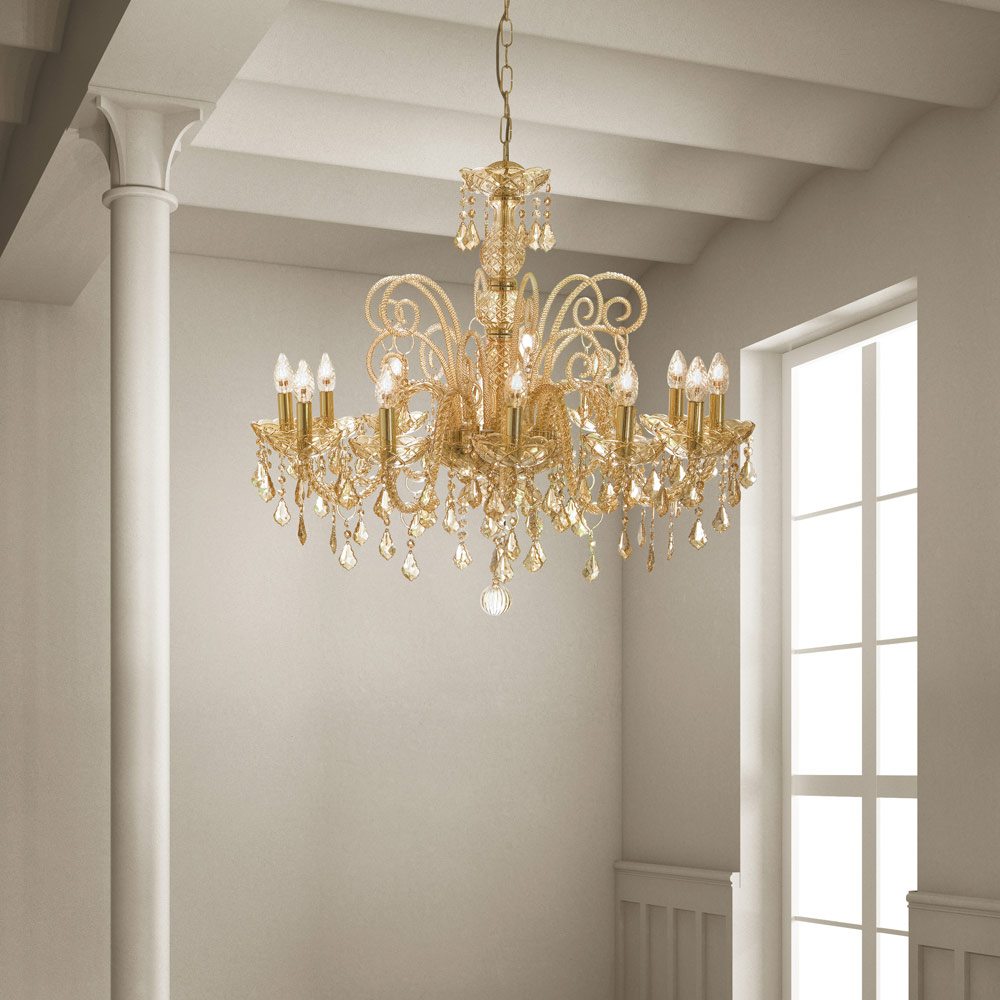 Kronleuchter aus venezianischem Glas mit Bernsteindekor mit nationalen Anhängern und poliertem verchromtem Metall . Diese handwerklich hergestellte Ergänzung zeichnet sich durch die wunderbaren Arme aus, die von Hand durch die Verdrehungstechnik bearbeitet wurden, wodurch ein exklusives Ergebnis entsteht, das ästhetisch an die Verflechtung eines Seils erinnert und dem Kronleuchter Persönlichkeit verleiht. Ein echter Lichtregen dringt in die Struktur des Kronleuchters ein und breitet sich dann durch Brechung durch die Magie von Pailletten und Kristallanhängern mit feinen Oberflächen in der Umgebung aus und erzeugt so einen eindrucksvollen und traumhaften szenografischen Effekt , der verzaubern und überraschen kann. für seine Eleganz und Majestät .