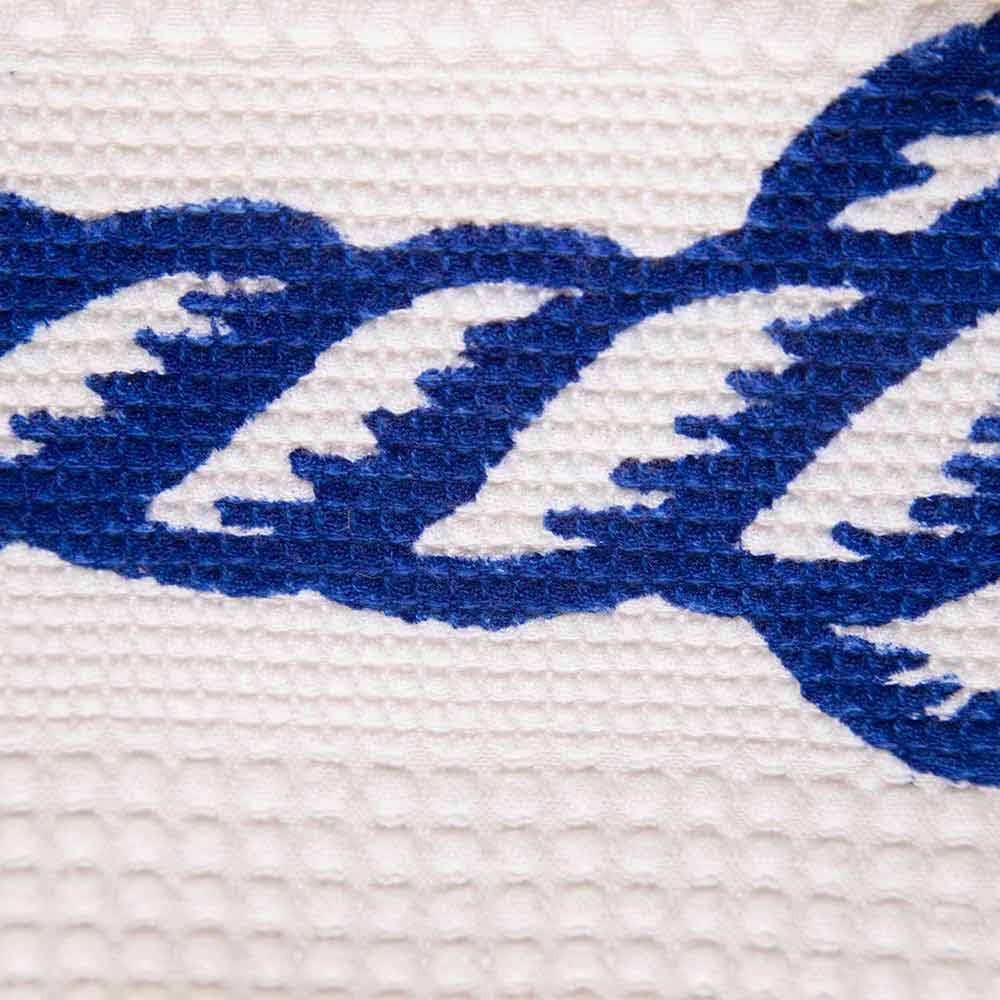 Hochwertiges Badetuch, handbedrucktes Blau auf weißer Baumwolle mit einer alten Seeseilzeichnung mit Knoten, ein exklusives Stück Made in Italy-Qualität.