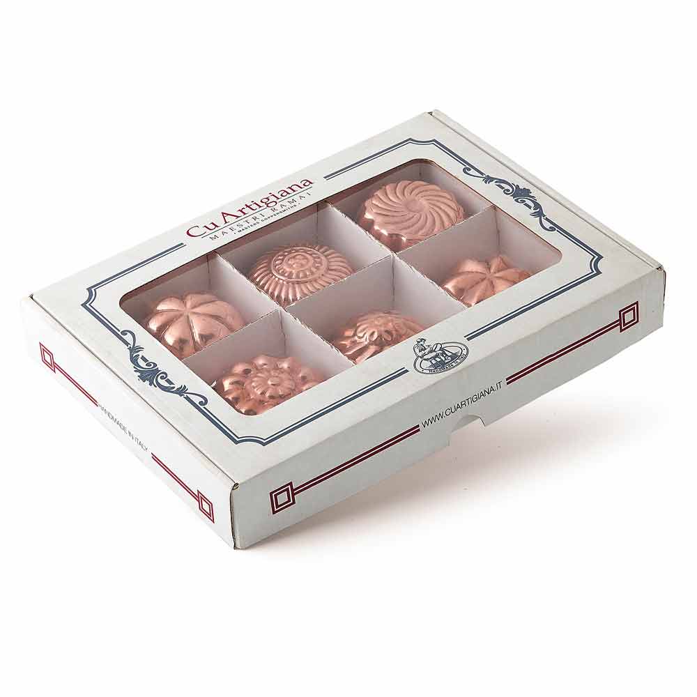 Handverzinnte Kupfer-Kuchenformen verschiedene Dekorationen mit Messingring, 6 Stück made in Italy.