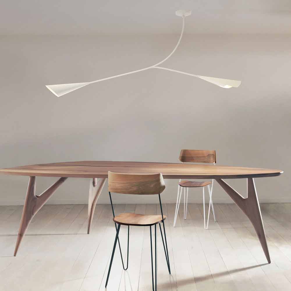 Das Design ist von der Natur inspiriert und bezieht sich klar auf die elegante Form der Calla. Dabei wird die besondere Asymmetrie der Stängel und langen Zapfen ausgenutzt, um die leichte und zarte Ästhetik zu unterstreichen. Seine Struktur überträgt ein starkes Beleuchtungspotential und bietet dank seiner Flexibilität die Möglichkeit, durch einfache manuelle Drehung ein diffuses, aber leicht gerichtetes Licht zu erhalten, was eine gültige Alternative zu den klassischeren Leselampen darstellt. Seine wichtigen Dimensionen machen es auch zu einer vielseitigen Lösung, die sich sowohl für Umgebungen wie Küchen eignet, in denen der Esstisch hervorgehoben wird, als auch für Wohn- und Schlafzimmer, in denen eine warme und einladende Atmosphäre geschaffen wird, in der Sie sich der Entspannung widmen können.