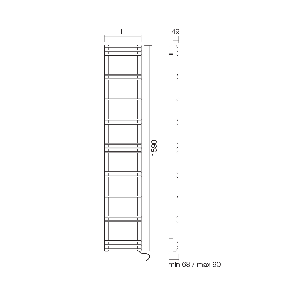 Elektrischer Handtuchwärmer aus tiefschwarzem Kohlenstoffstahl mit horizontalen Elementen und vertikalen Kollektoren, vollständig in Italien hergestellt , inklusive Wandbefestigungsset . Elektrifizierungssatz unten rechts positioniert.