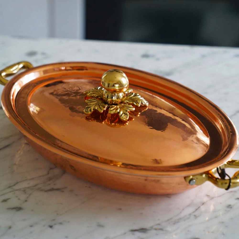 ovale Pfanne aus handgehämmertem massivem Kupfer mit Deckel und Griffen drückt die absolute Meisterschaft der Handwerkskunst nach