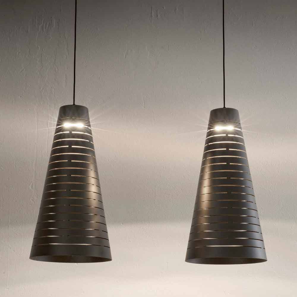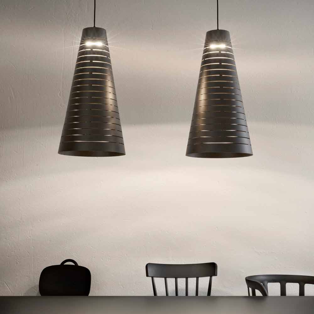 Cervino ist eine moderne Lampe aus emailliertem Stahl mit industrieller Ausstrahlung. Die besonderen horizontalen Schlitze der Struktur ermöglichen ein angenehmes Licht- und Schattennetzwerk, das eine intime und einladende Atmosphäre schafft.