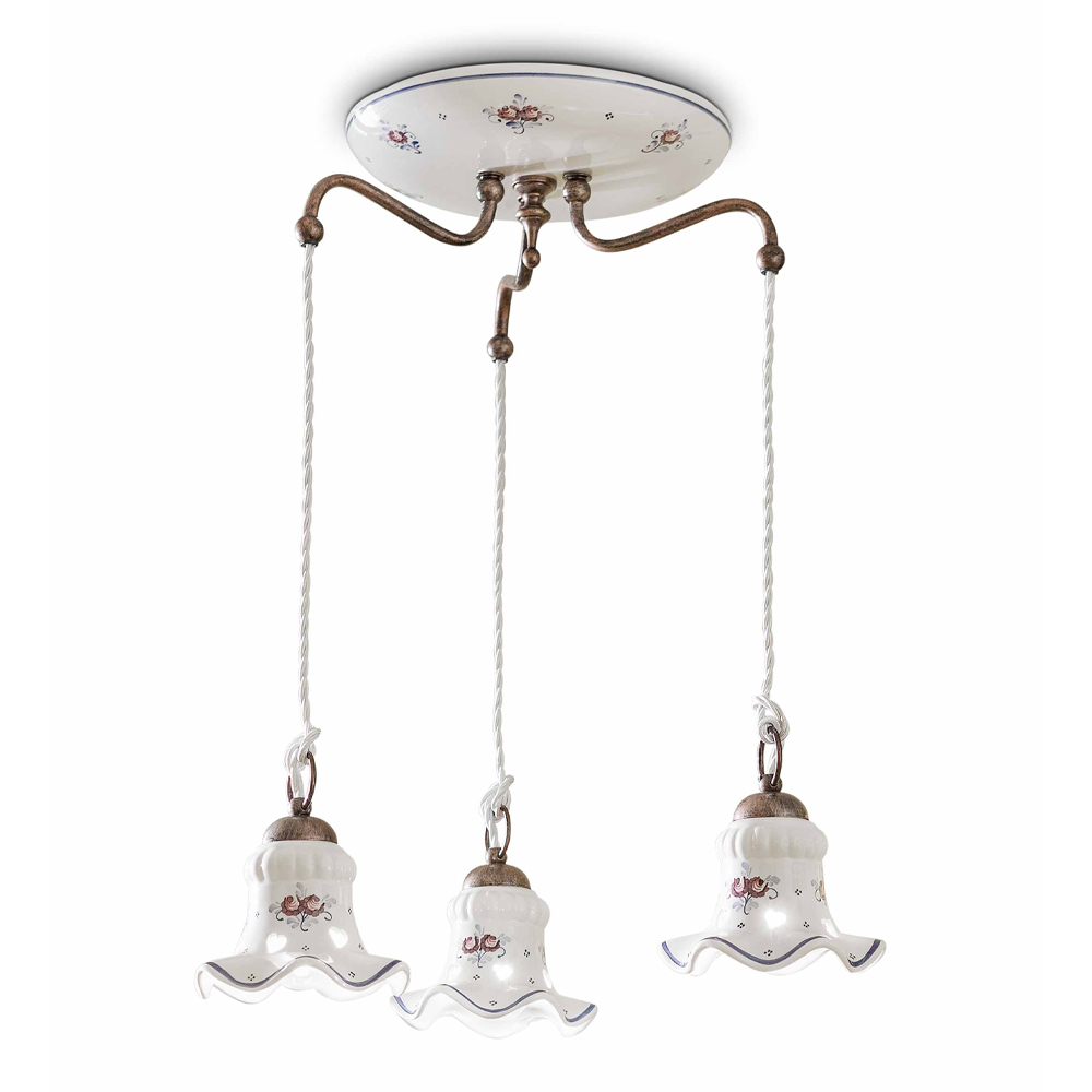 Die 3-flammige Hängelampe mit rundem Sockel besteht vollständig aus Eisen und Keramik mit zarten handgemalten Verzierungen , die die Handwerkskunst und Geschicklichkeit der Handwerker unterstreichen.