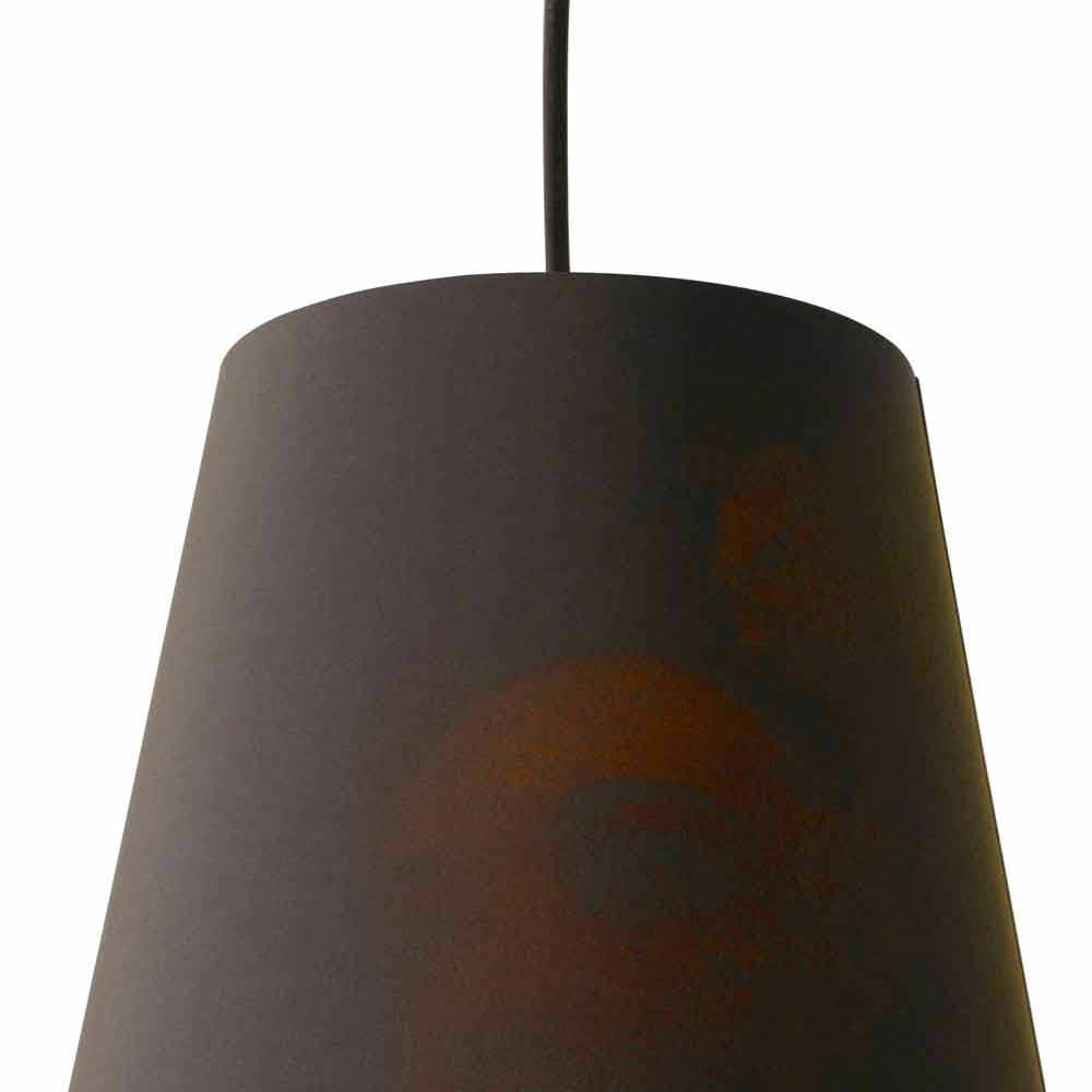 Diese originelle und einzigartige Hängelampe wurde mit dem Ziel entwickelt, die Welt der technischen und dekorativen Beleuchtung koexistieren und koexistieren zu lassen. Eine Ergänzung, bei der Ästhetik und Funktionalität zugunsten eines zeitgemäßen Designs kombiniert werden, das aus einem Lampenschirm aus anthrazitfarbenem Stoff besteht , der im Inneren einen "Ich sehe nicht" -Effekt erzeugt, der seine Hauptbesonderheit verbirgt: einen modernen Innendruck des Gesichts von eine Frau, die in der Lage ist, suggestive Atmosphären zu wecken und traditionelle Pläne zu brechen.